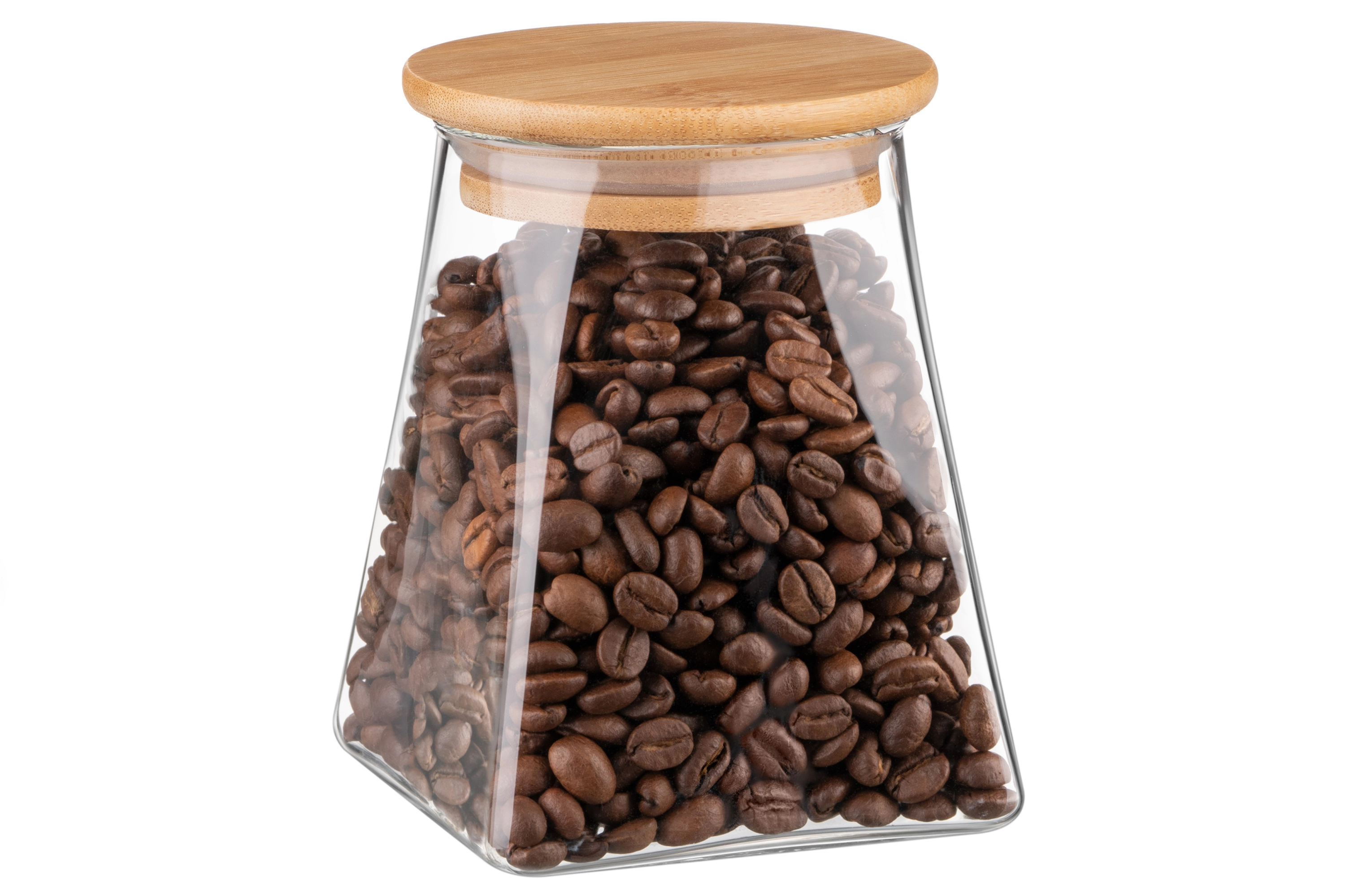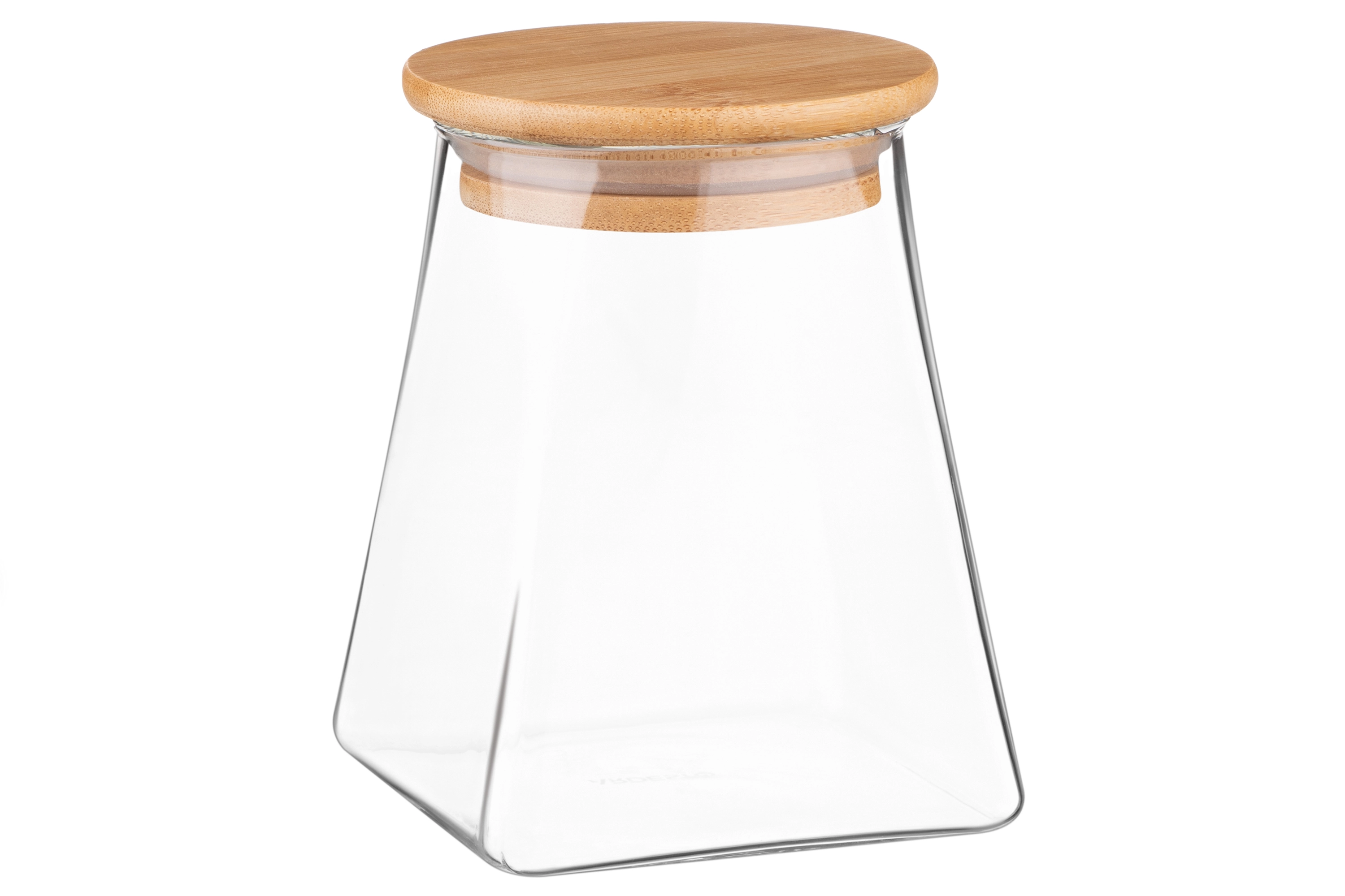 Прозора банка для зберігання з боросилікатного скла має конусну форму й об’єм 510 мл. Оснащена щільною бамбуковою кришкою. Висота – 12 см. Можна мити в посудомийній машині.