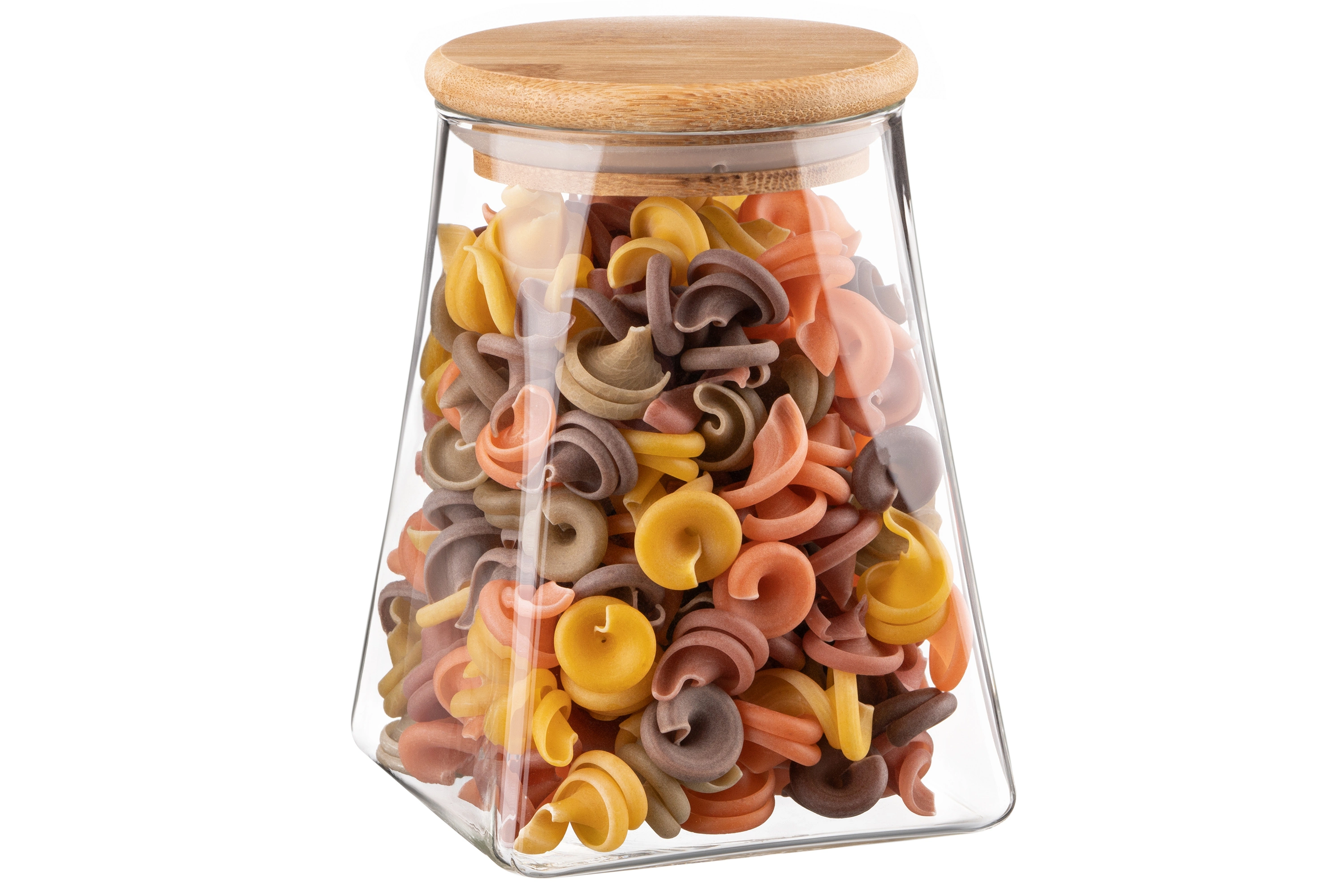 Прозора банка для зберігання з боросилікатного скла має конусну форму й об’єм 740 мл. Оснащена щільною бамбуковою кришкою. Висота – 13,5 см. Можна мити в посудомийній машині.