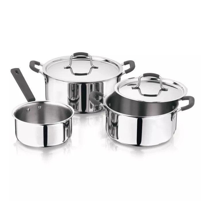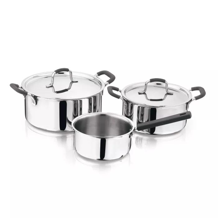 Набір посуду з двома каструлями та ковшем від MasterPro. Виготовлений з нержавіючої сталі та оснащений кришками з нержавіючої сталі та силікону. Посуд сумісний з усіма джерелами нагріву, включаючи індукційні плити. Комплектація: Ківш без кришки 16 см Каструля з кришкою 20 см Каструля з кришкою 24 см]]>
