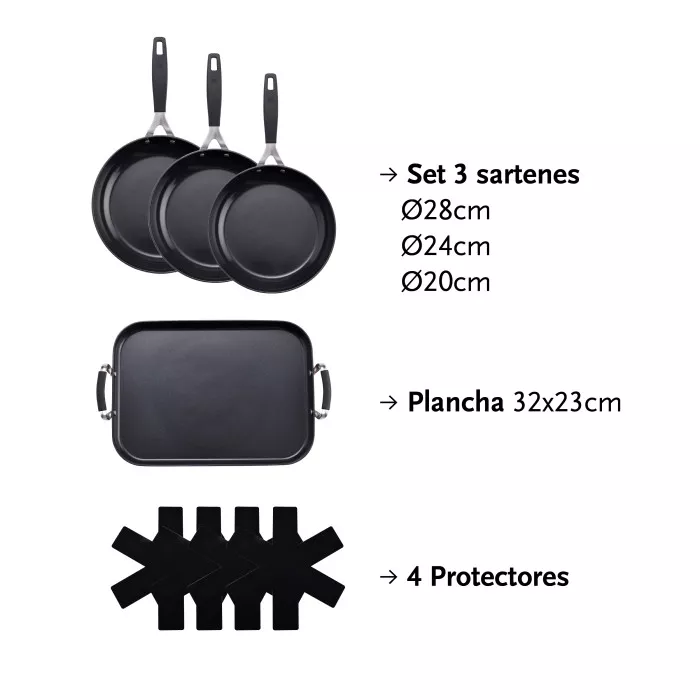 Набір включає сковорідки та пательню-гриль. Оснащений антипригарним покриттям PPG FUSION® HR, сумісний з усіма типами плит. У комплекті також 4 захисні протектори. Комплектація: Сковорідки 20 см, 24 см, 28 см Пательня-гриль 32×23 см 4 захисні протектори]]>
