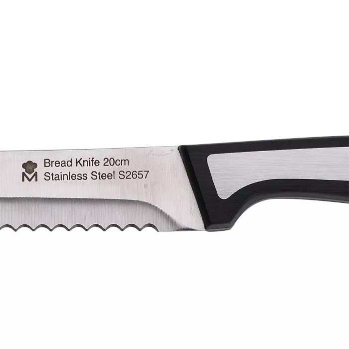 Ніж MasterPro Sharp, 20 см, призначений для рівного нарізання хліба. Зубчасте лезо з нержавіючої сталі легко прорізає скоринку, не деформуючи м’якуш. Рекомендується ручне миття для збереження гостроти.]]>