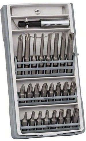 Набір біт Bosch Mini X-Line Extra Hard, з універсальним магнітним тримачем, 25 шт. 2.607.017.037. Набір насадок для викрутки X-Pro Line з 25 предметів, включаючи тримач для насадок. Ця наджорстка насадка для викрутки є хорошим вибором для універсального використання. Усі завдання досяжні завдяки модифікованій сталі S2 насадки та оптимізованому процесу термічної обробки, що забезпечує надтверду якість і належну продуктивність. Конічна торсіонна зона наконечника легко справляється з піками крутного моменту, поглинаючи силу та вібрацію під час загвинчування, виконуючи всі завдання.