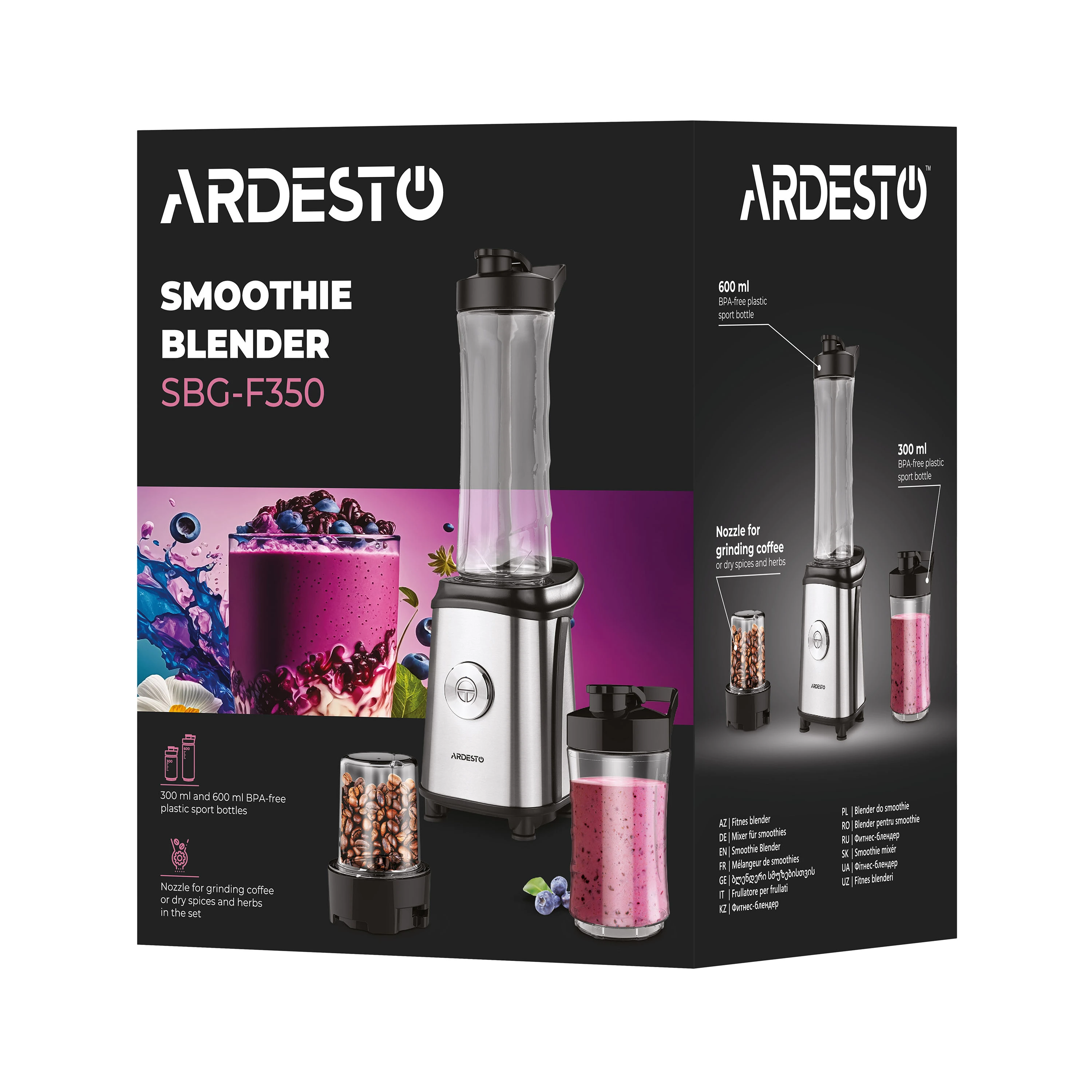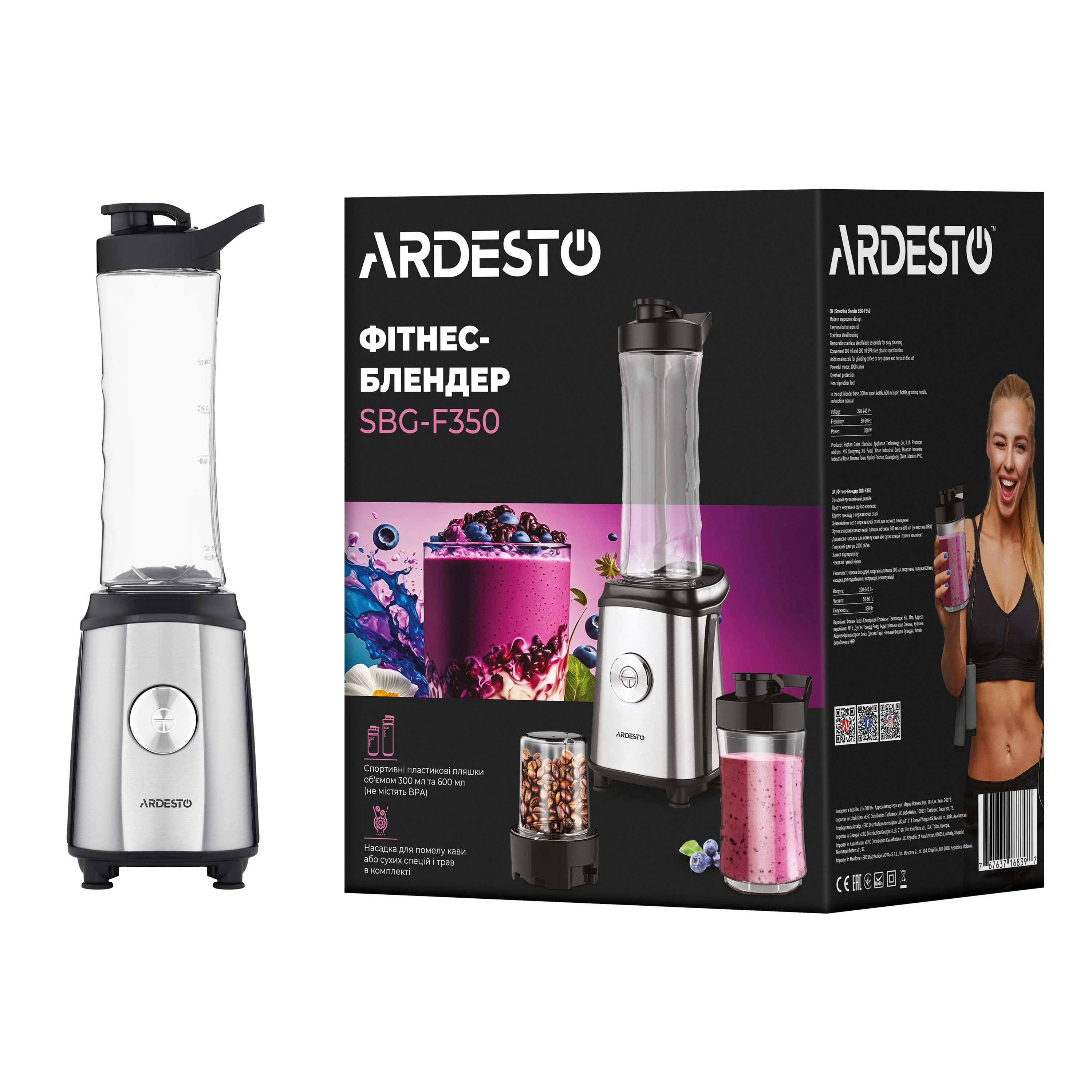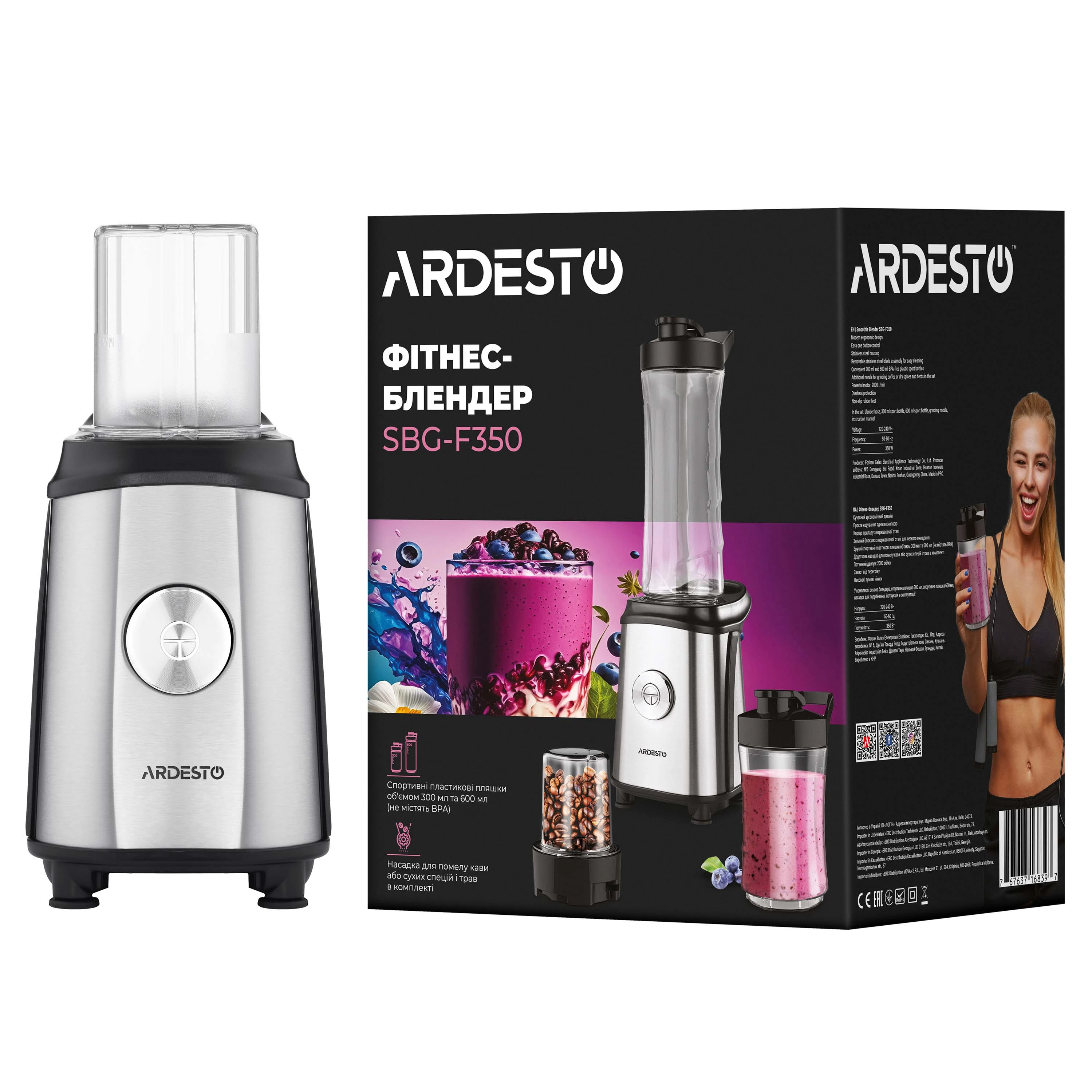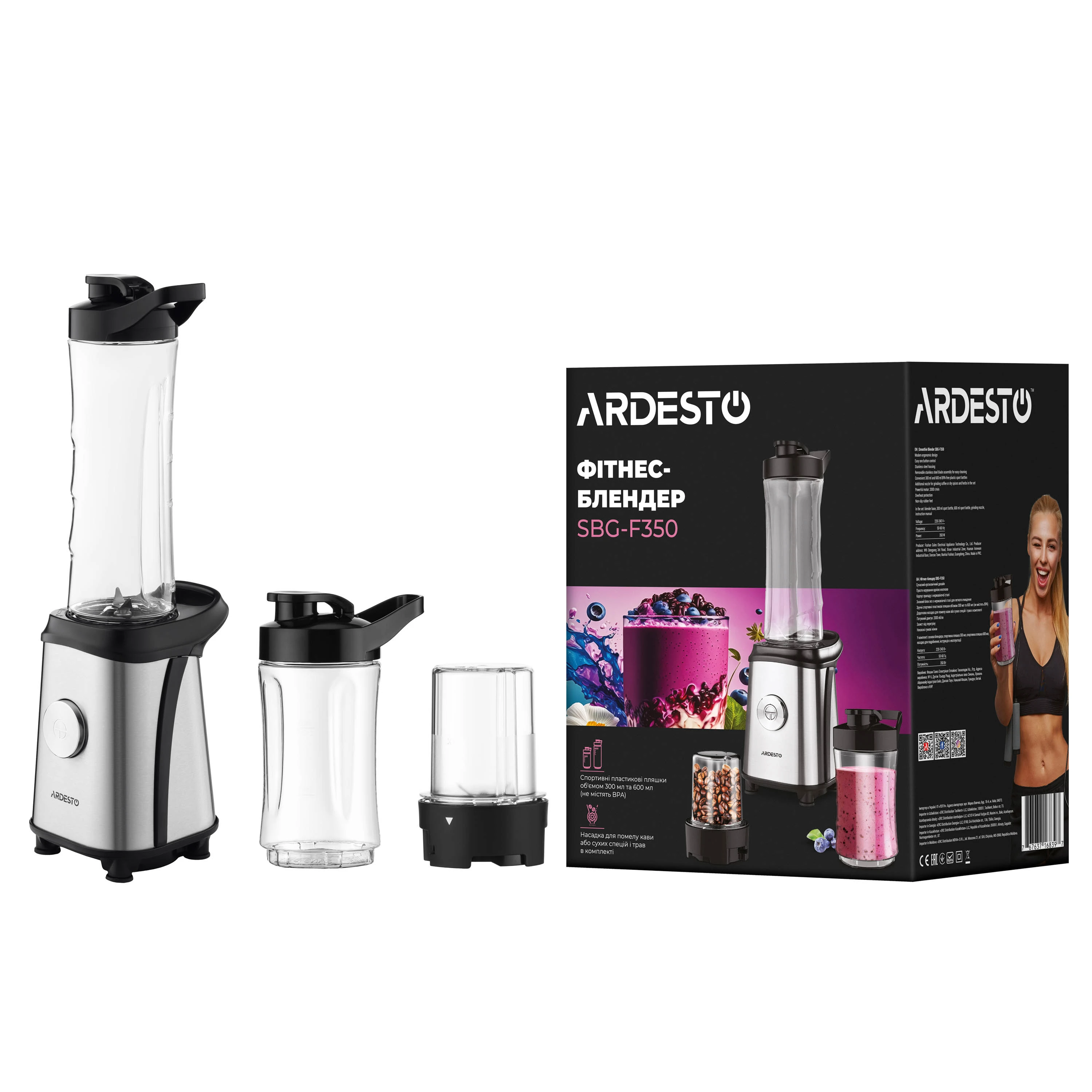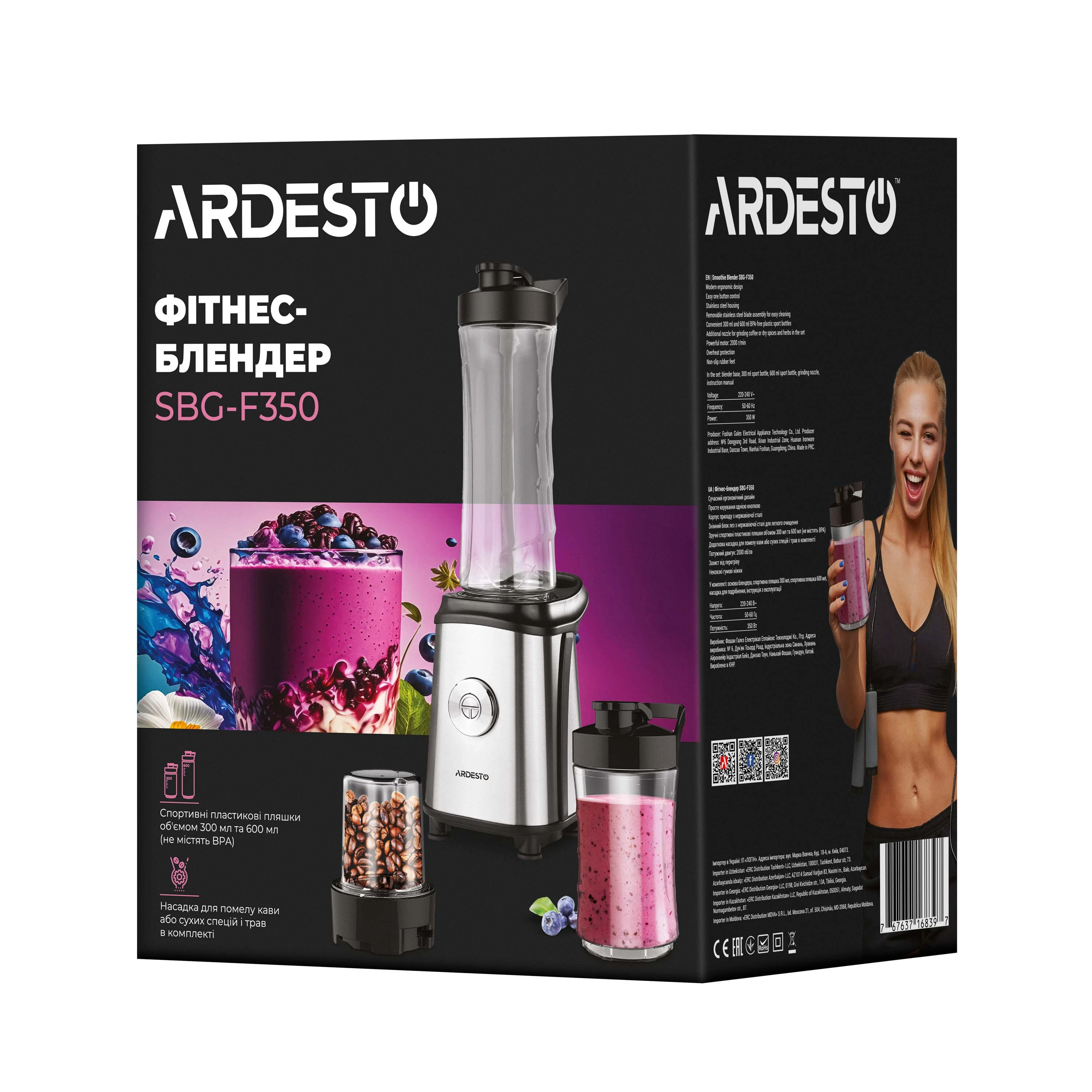Блендер для смузі Ardesto SBG-F350, 350Вт,2в1, пляшка -600мл, пляшка -300 мл, кавомолка , чорно-сріб