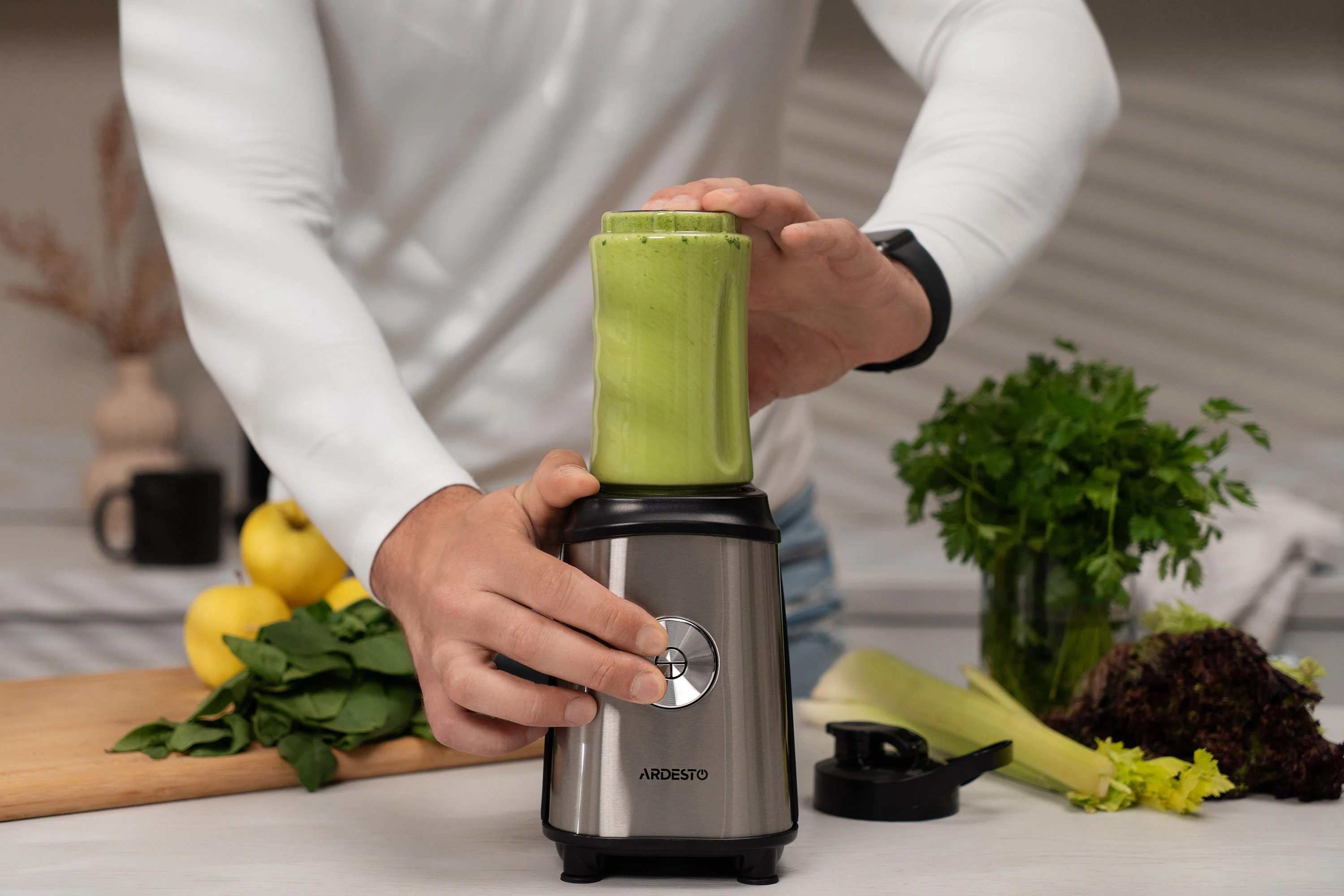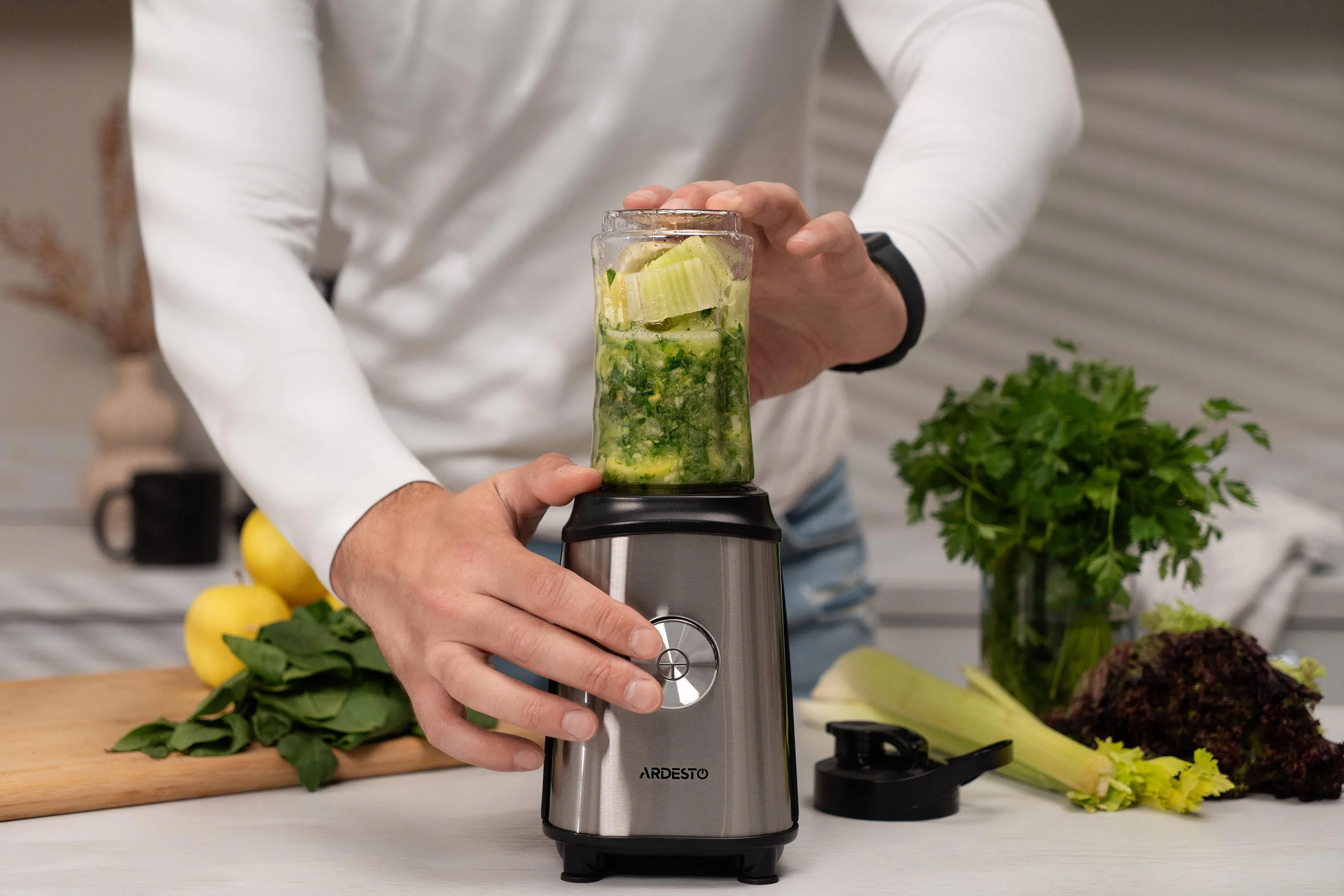Фітнес-блендер SBG-F350 виготовлено в сучасному ергономічному дизайні. Продуманий до дрібниць корпус пристрою виготовлений з нержавіючої сталі та містить потужний двигун 2 000 об./хв. Легкість використання забезпечує просте керування однією кнопкою.