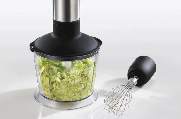 Блендер Gorenje HBC807QB/800 Вт виконий з металу та практичного пластику, а також відрізняється простотою кріплення насадки - вона прикручується до ручки. У комплекті йдуть ємності для подрібнення і збивання, а однією з кирисних функцій є імпульсний режим. Увімкнення відбувається натисканням кнопки. Блендер має плавне регулювання швидкості.