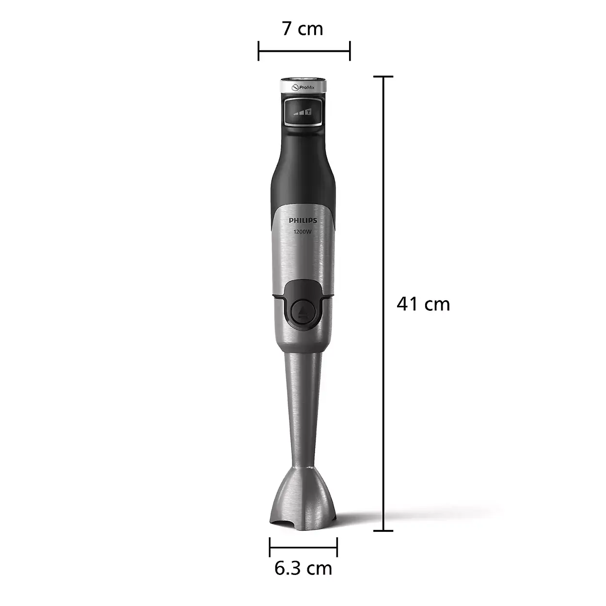 Ручний блендер Philips серії 5000 зі збільшеною на 50% потужністю здатний подрібнити будь-які інгредієнти, що робить його ідеальним варіантом для отримання смачних та однорідних страв. Насолоджуйтесь крем-супами та ніжними соусами, відкриваючи для себе нові способи приготування їжі! Запатентована технологія ProMix поєднує найпотужніший двигун з унікально розробленим блоком лез і захистом від бризок, забезпечуючи оптимальне перемішування їжі, легкість у чищенні та відсутність безладу. Отримуйте швидкі та відмінні результати щоразу.