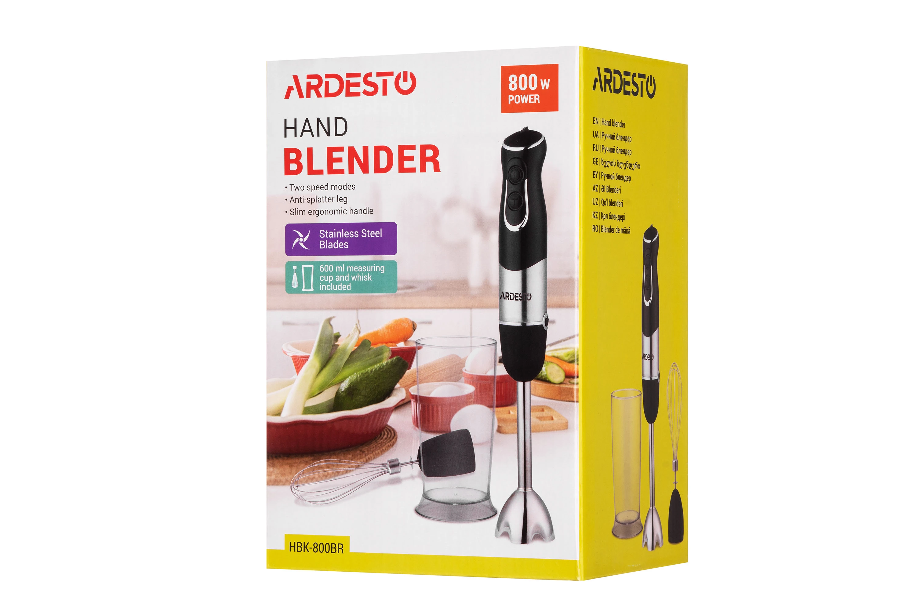 Ергономічний ручний блендер ARDESTO HBK-800BR занурювального типу потужністю 800 Вт стане у пригоді під час приготування соусів, супів, майонезу, дитячого харчування та молочних коктейлів. Комплектується мірним стаканом 600 мл та насадкою-віничком.