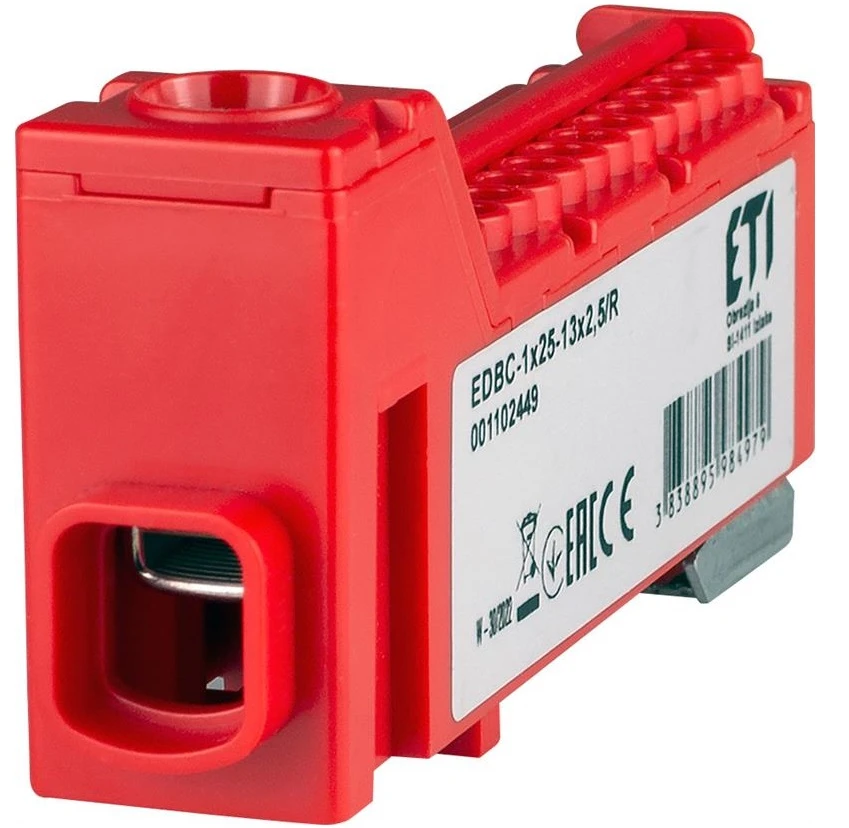 Блок розподільчий ETI, EDBC-1x25-13x2,5/R (63A, 1000V AC/1500V DC, IN: 1x25, OUT: 13x2,5; червоний)