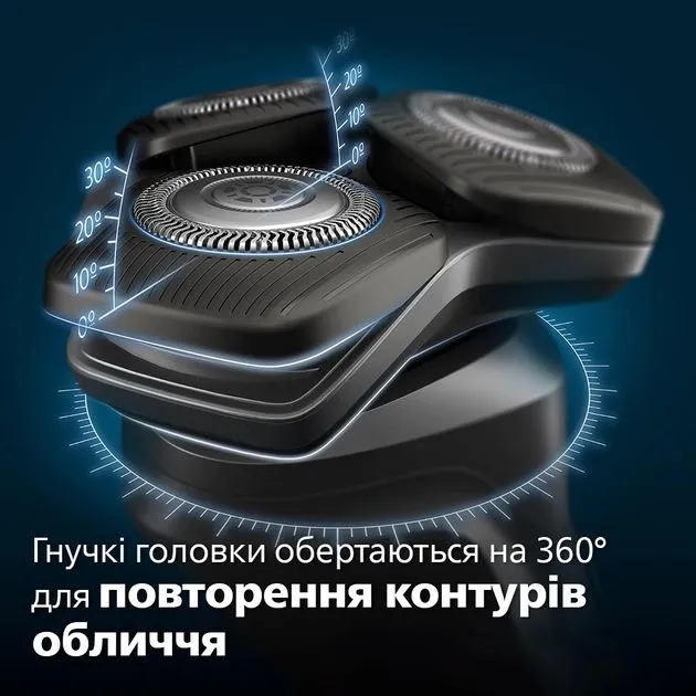 Завдяки 90 000 зрізів за хвилину леза SteelPrecision забезпечують гладке гоління та більш високу ефективність у кожному русі. Ці 45 високоефективних лез, що самозаточуються, виготовлені в Європі. Інтелектуальний датчик вимірює параметри щетини 250 разів на секунду, а технологія автоматично адаптує потужність бритви для максимально дбайливого та ефективного гоління. Повністю рухливі головки обертаються на 360°, дотримуючись контурів вашої особи, завдяки чому досягається оптимальний контакт зі шкірою для ретельного та комфортного гоління.