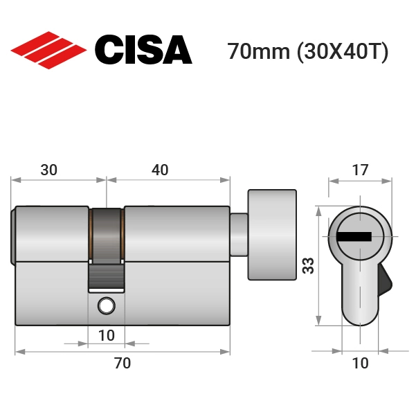 Цилиндр CISA ASIX P8 70T (30*40T) никель матовый 5 ключей