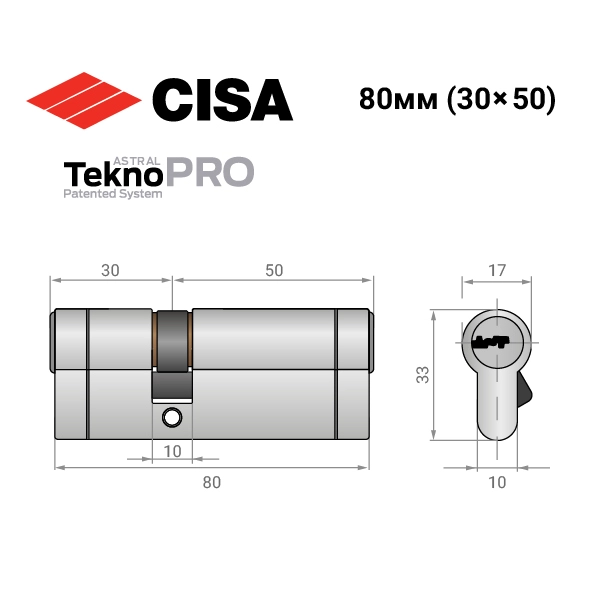 Цилиндр CISA Astral Tekno PRO 80 (30*50) никель матовый 5 ключей