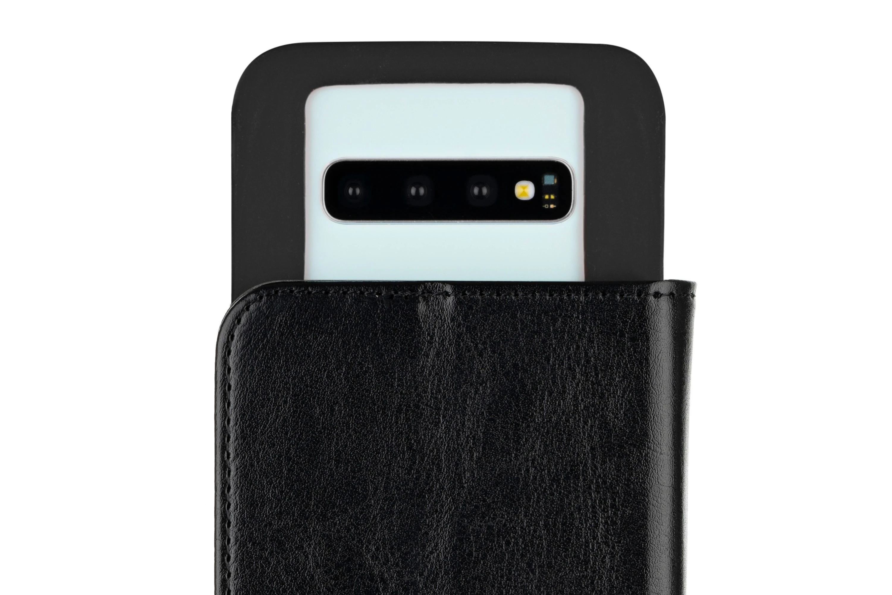 Зовні чохол виконаний із якісної гладкої PU шкіри, внутрішній шар з мікрофібри. Щільний силіконовий тримач для смартфона товщиною 2 мм стійкий до розтягування і щоденного зносу. Для зручного користування камерою є вбудований слайдер. Закритий чохол надійно фіксується магнітної застібкою. Чохол може бути використаний в режимі стенду для читання і перегляду відео. Усередині чохла зручне відділення для готівки і три слота для кредитних карт.