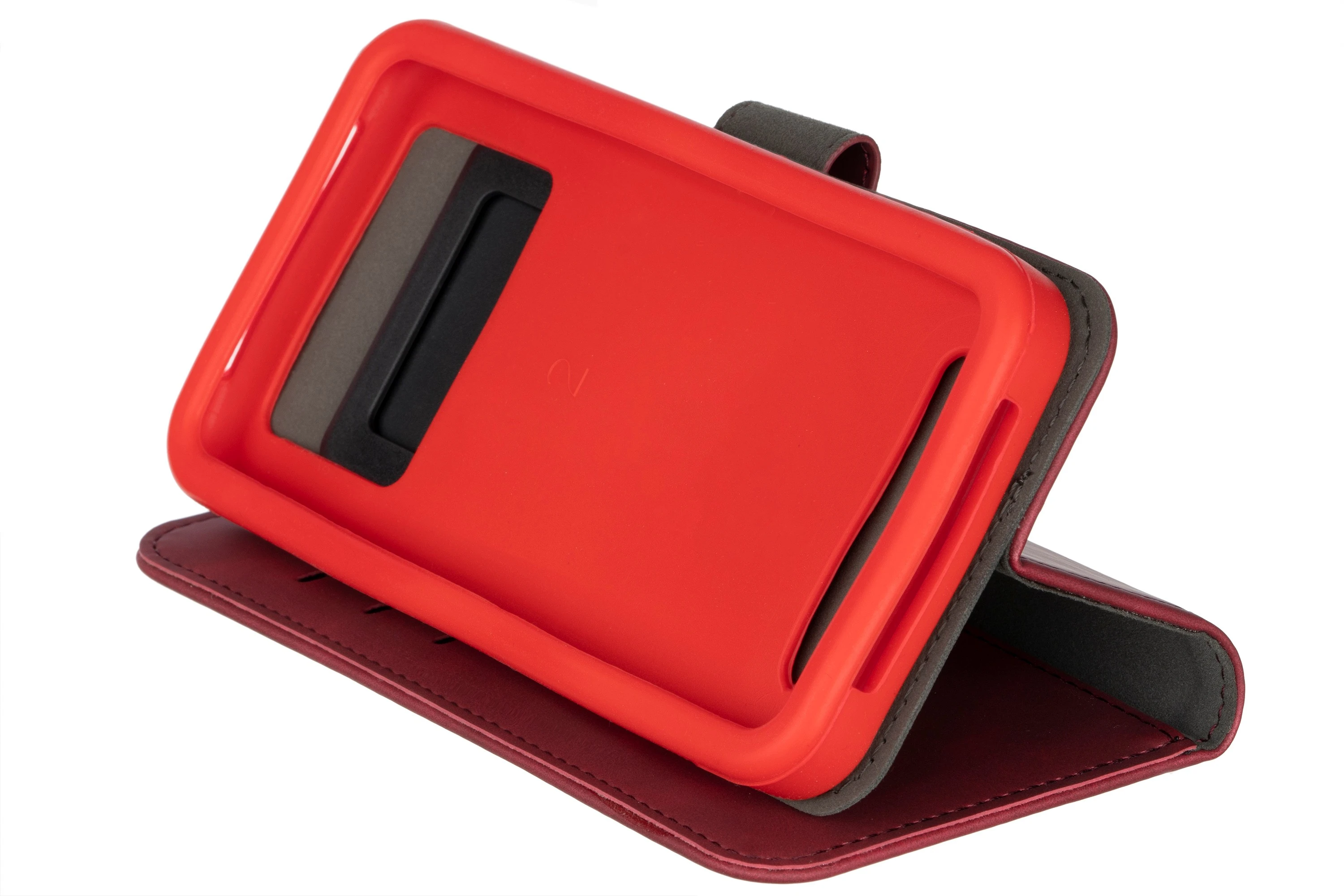 Зовні чохол виконаний з шовковистої матової PU шкіри, внутрішній шар з мікрофібри. Щільний силіконовий тримач для смартфона товщиною 2 мм стійкий до розтягування і щоденного зносу. Для зручного користування камерою є вбудований слайдер. Закритий чохол надійно фіксується магнітної застібкою. Чохол може бути використаний в режимі стенду для читання і перегляду відео.