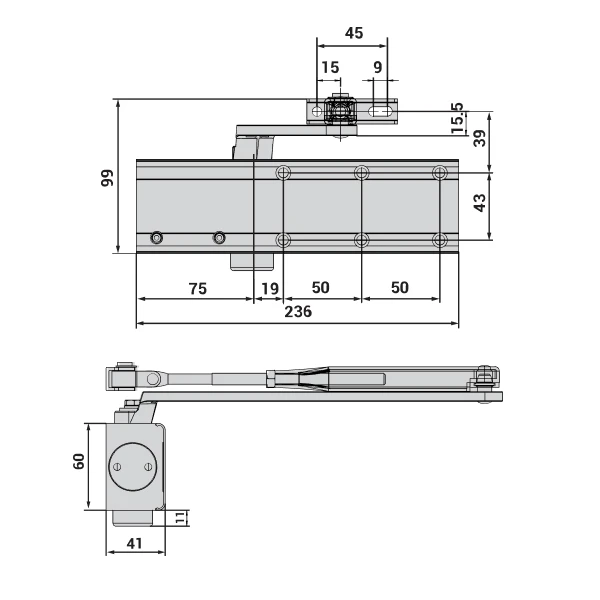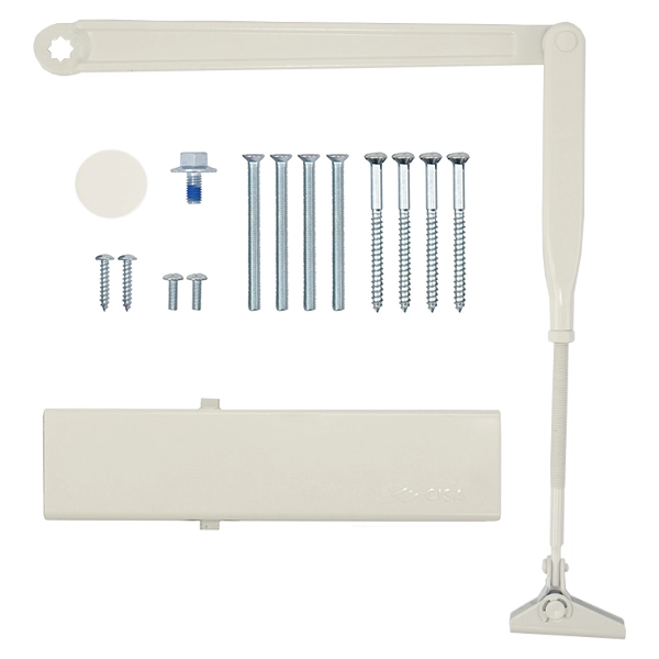 Також в даній моделі сила закривання EN 2-4 регулюється обертанням гвинта на боковій частині корпуса. В комплектації присутня стандартна тяга без фіксації дверного полотна у відкритому положенні. Проте даний дотягувач сертифікований для використання з протипожежними дверима.