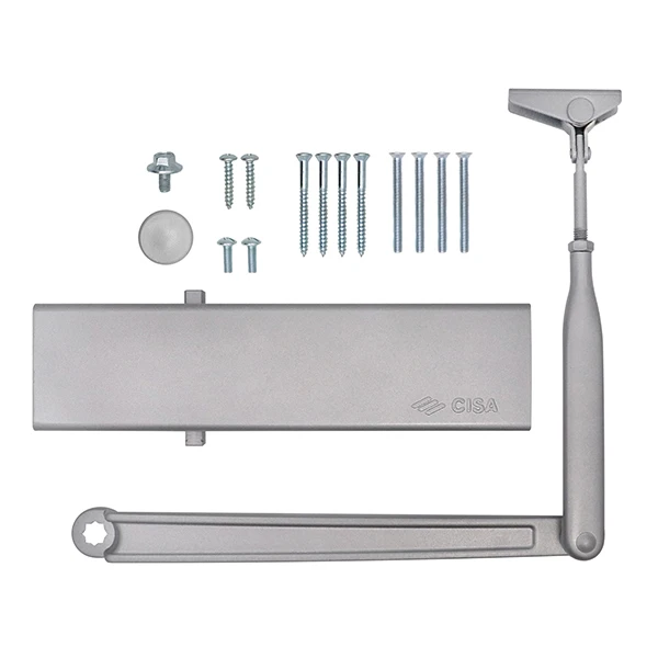 Також в даній моделі сила закривання EN 2-4 регулюється обертанням гвинта на боковій частині корпуса. В комплектації присутня стандартна тяга без фіксації дверного полотна у відкритому положенні. Проте даний дотягувач сертифікований для використання з протипожежними дверима.