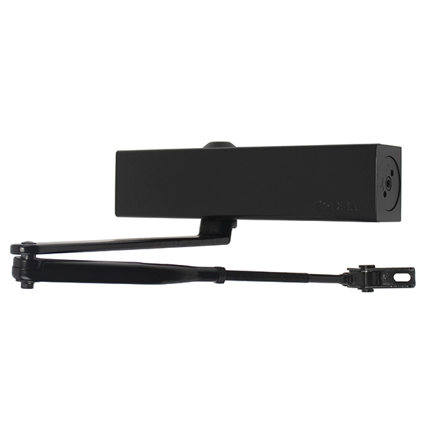Також в даній моделі сила закривання EN 2-4 регулюється обертанням гвинта на боковій частині корпуса. В даній комплектації присутня стандартна тяга з фіксацією дверного полотна у відкритому положенні до 130°. Це дає можливість залишити двері відчиненими для провітрювання чи для зручності користування у комерційних приміщеннях.