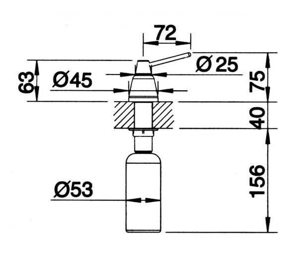 Диспенсер для миючих засобів для установки на поверхні мийки або на стільниці. Необхідний розмір отвору 35 мм. Об'єм 250 мл.