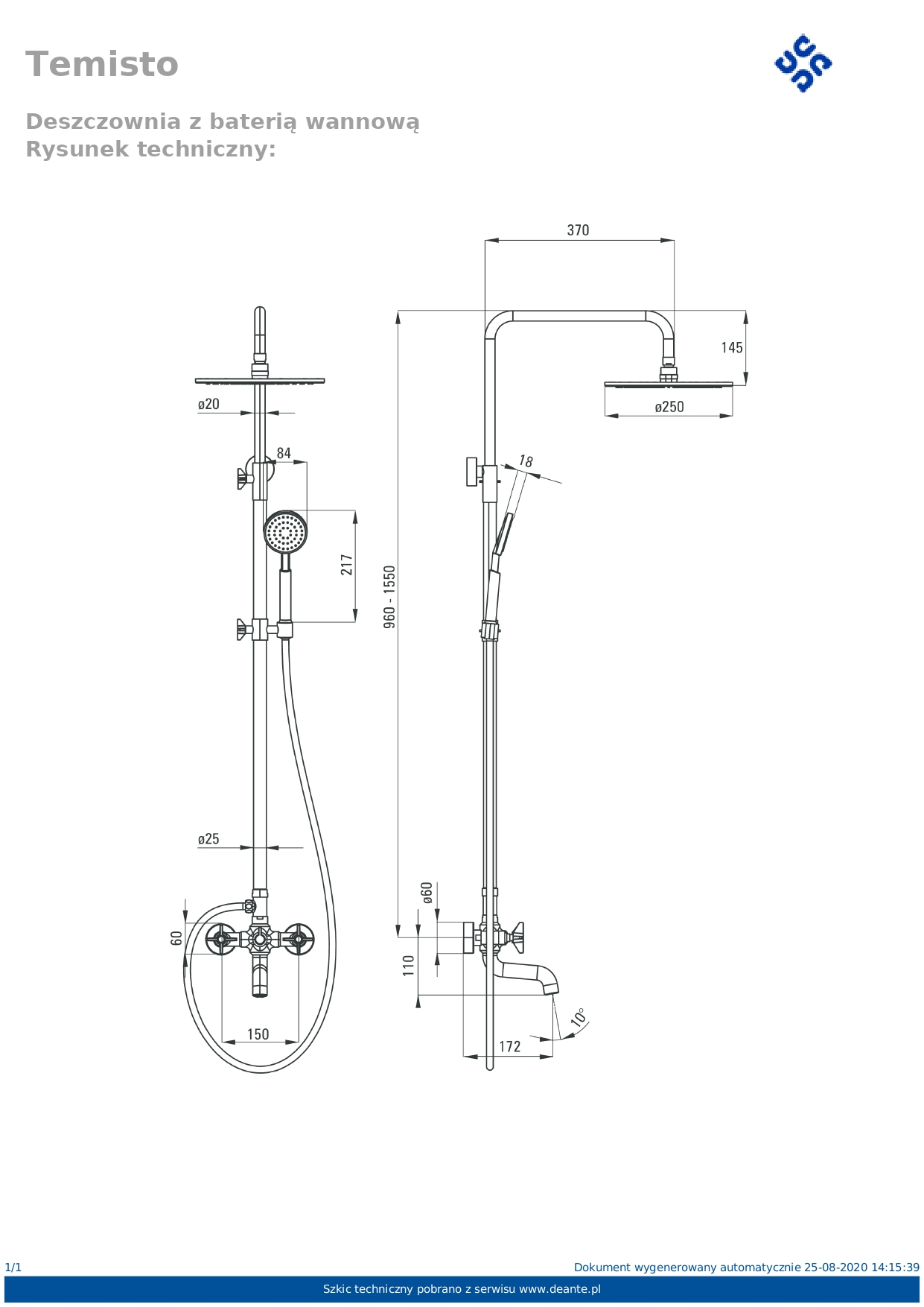 Душова система Deante Temisto зі змішувачем для ванни, душ - верхній душ, лійка, кріпленн на стійці