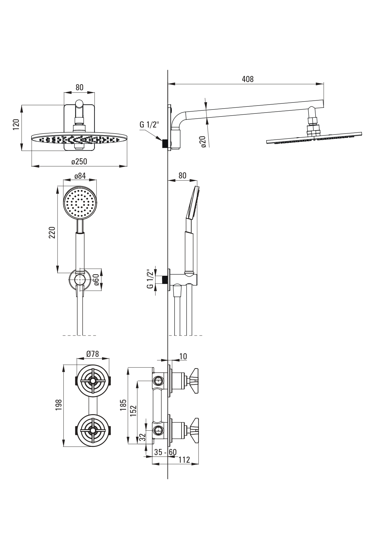 - Диаметр (ширина) верхнего душа 250