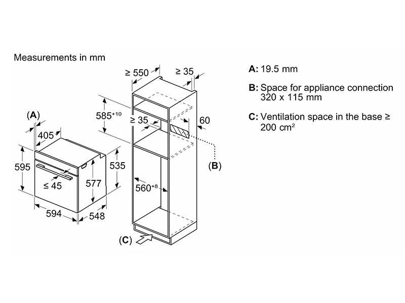 Розміри ніші (ВxШxГ): 585 мм - 595 мм x 560 мм - 568 мм x 550 мм