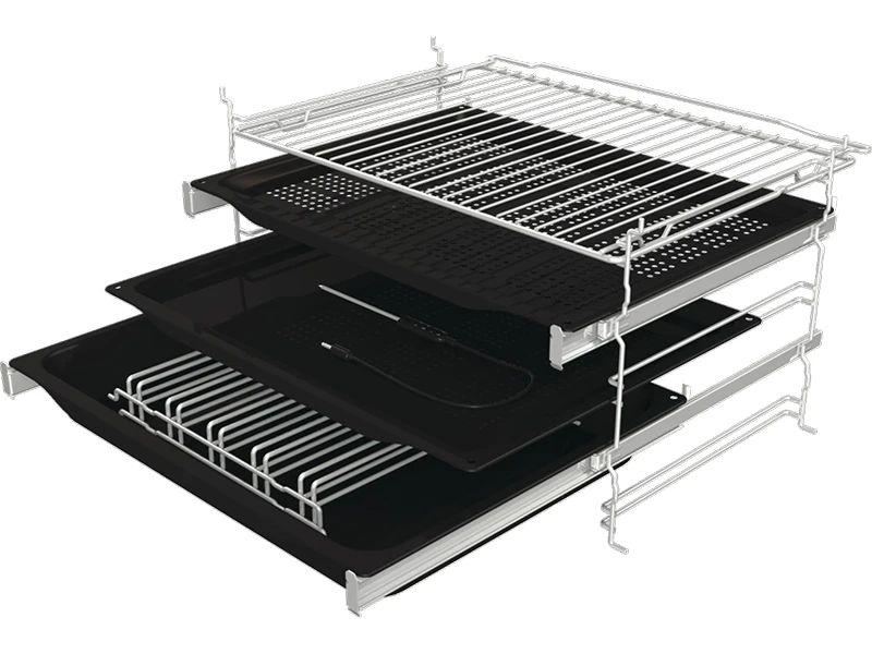 Телескопічні направляючі рухи відбуваються плавно та забезпечують чудовий огляд процесу випікання, а також простоту й безпечність користування деками. Залежно від моделі, духові шафи Gorenje OptiBake оснащені телескопічними напрямками, які висуваються на 3/4 своєї довжини, на одному або двох рівнях. Також доступні додаткові гнучки однорівневих телескопічних напрямних, які можна легко закріпити на потрібному рівні дротяних напрямних.