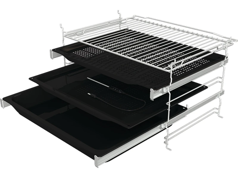 Телескопічні направляючі рухаються плавно та забезпечують чудовий огляд процесу випікання, а також простоту та безпечність користування деками. Залежно від моделі, духові шафи Gorenje OptiBake оснащені телескопічними напрямними, що висуваються на 3/4 своєї довжини, на одному або двох рівнях. Також доступні додаткові гнучкі однорівневі телескопічні напрямні, які можна легко закріпити на потрібному рівні дротяних напрямних.