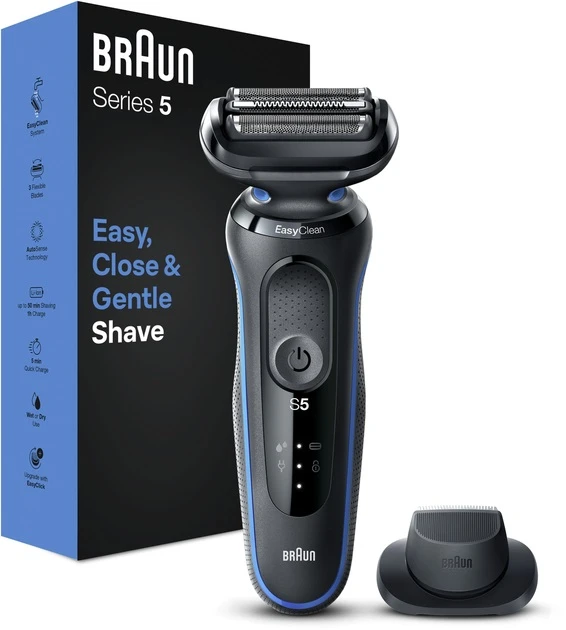 Чоловіча електробритва Braun Series 5 із 3 плаваючими лезами для легкого гоління, яке адаптується до контурів вашого обличчя. Система EasyClean забезпечує швидке та легке очищення, не знімаючи бритвену головку. Літій-іонний акумулятор забезпечує до 3 тижнів гоління та швидко заряджається за 5 хвилин для 1 гоління. Електробритва на 100 % водонепроникна і дозволяє як сухе, так і вологе гоління. Сумісна із EasyClick, щоб розширити можливості вашої бритви.