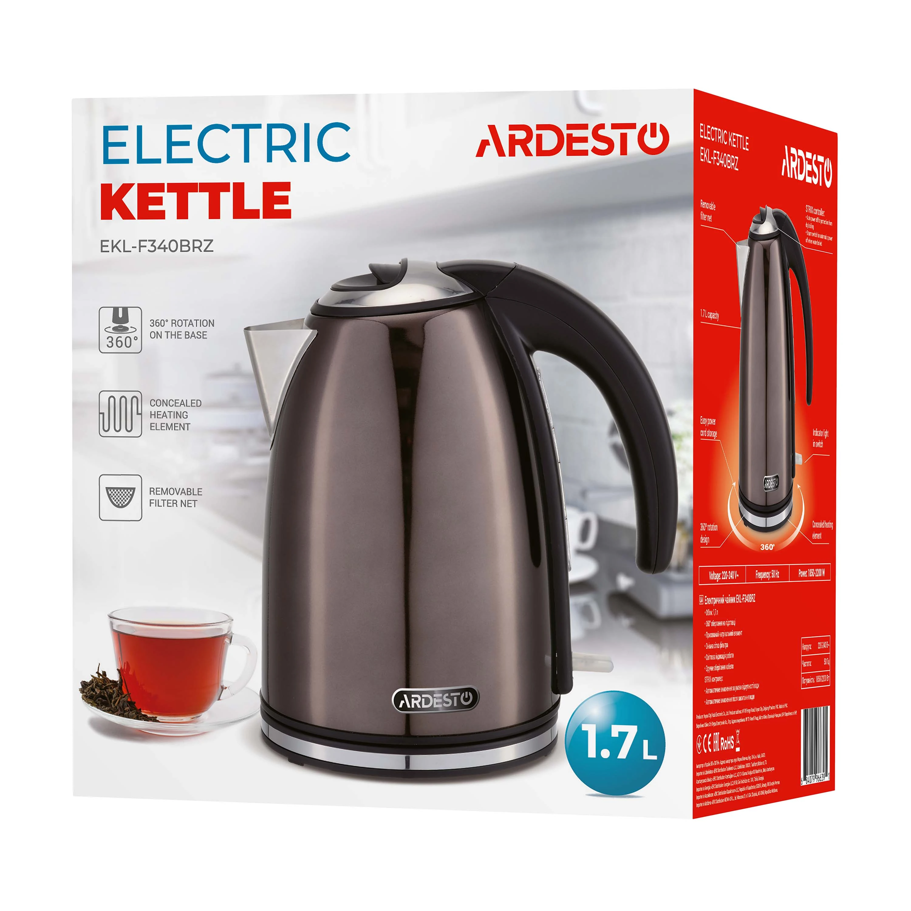 Електрочайник ARDESTO EKL-F340BRZ виготовлено з нержавіючої сталі. Об’єм чайника становить 1,7 л. Стійка підставка обертається на 360°. Модель оснащено британським контролером Strix. Потужність пристрою становить 2 200 Вт. Нагрівальний елемент прихований, ручка ергономічна. Автоматично вимикається за відсутності води чи після її закипання. Має знімний фільтр від накипу. Модель оснащено світловим індикатором на клавіші вмикання та зручною шкалою рівня води.