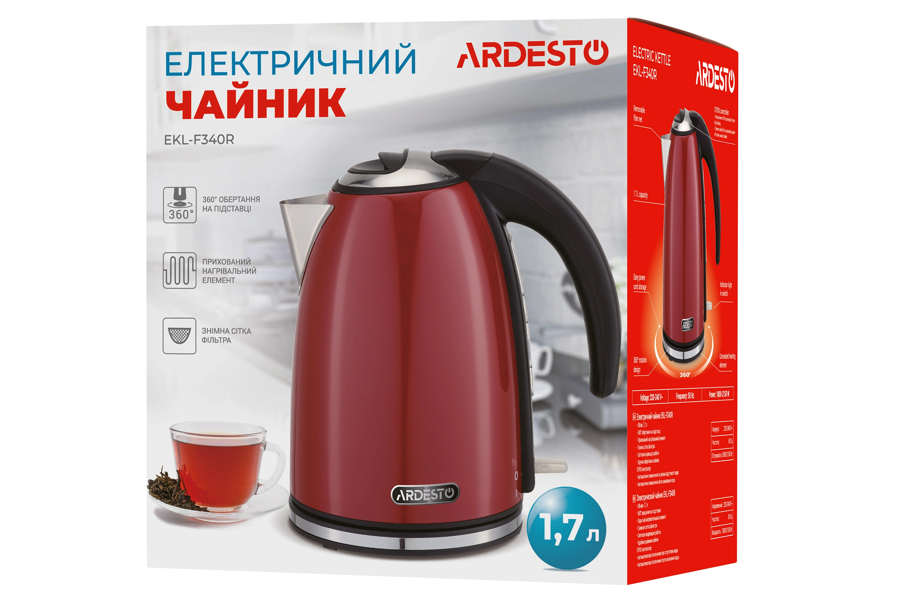 Електрочайник ARDESTO EKL-F340R виготовлено з нержавіючої сталі. Об’єм чайника становить 1,7 л. Стійка підставка обертається на 360°. Модель оснащено британським контролером Strix. Потужність пристрою становить 2 200 Вт. Нагрівальний елемент прихований, ручка ергономічна. Автоматично вимикається за відсутності води чи після її закипання. Має знімний фільтр від накипу. Модель оснащено світловим індикатором на клавіші вмикання та зручною шкалою рівня води.