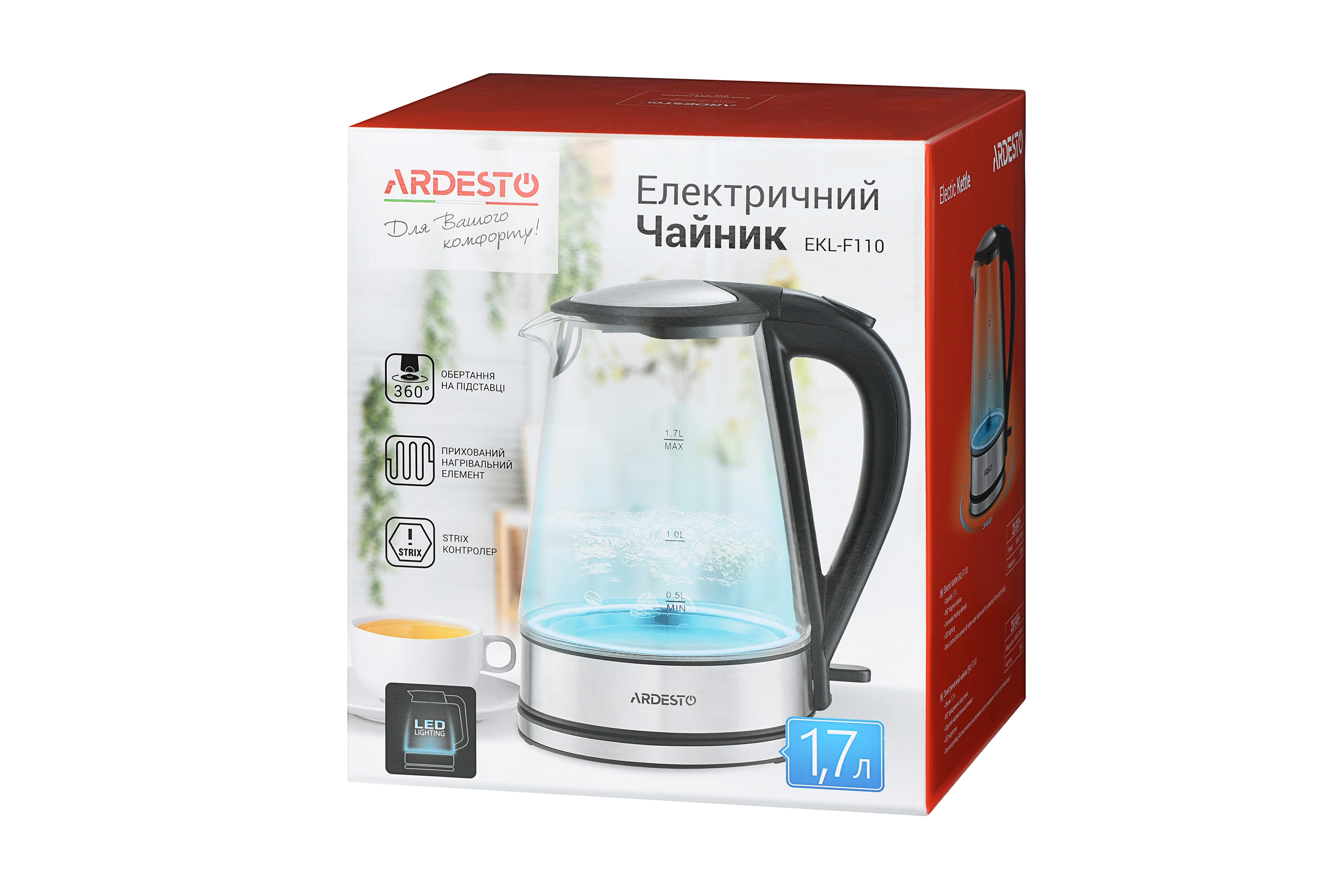 Прозорий скляний електрочайник з LED-підсвіткою та Strix-контролером для захисту від перегріву. Об`єм чайника EKL-F110 складає 1,7 літра, а підставка забезпечує оберт на 360°. Матеріал підставки, основи та ручки – полікарбонат чорного кольору та шліфований метал. Основна частина чайника виконана з міцного загартованого скла з відмітками об’єму від 0.5 л до 1.7 л.