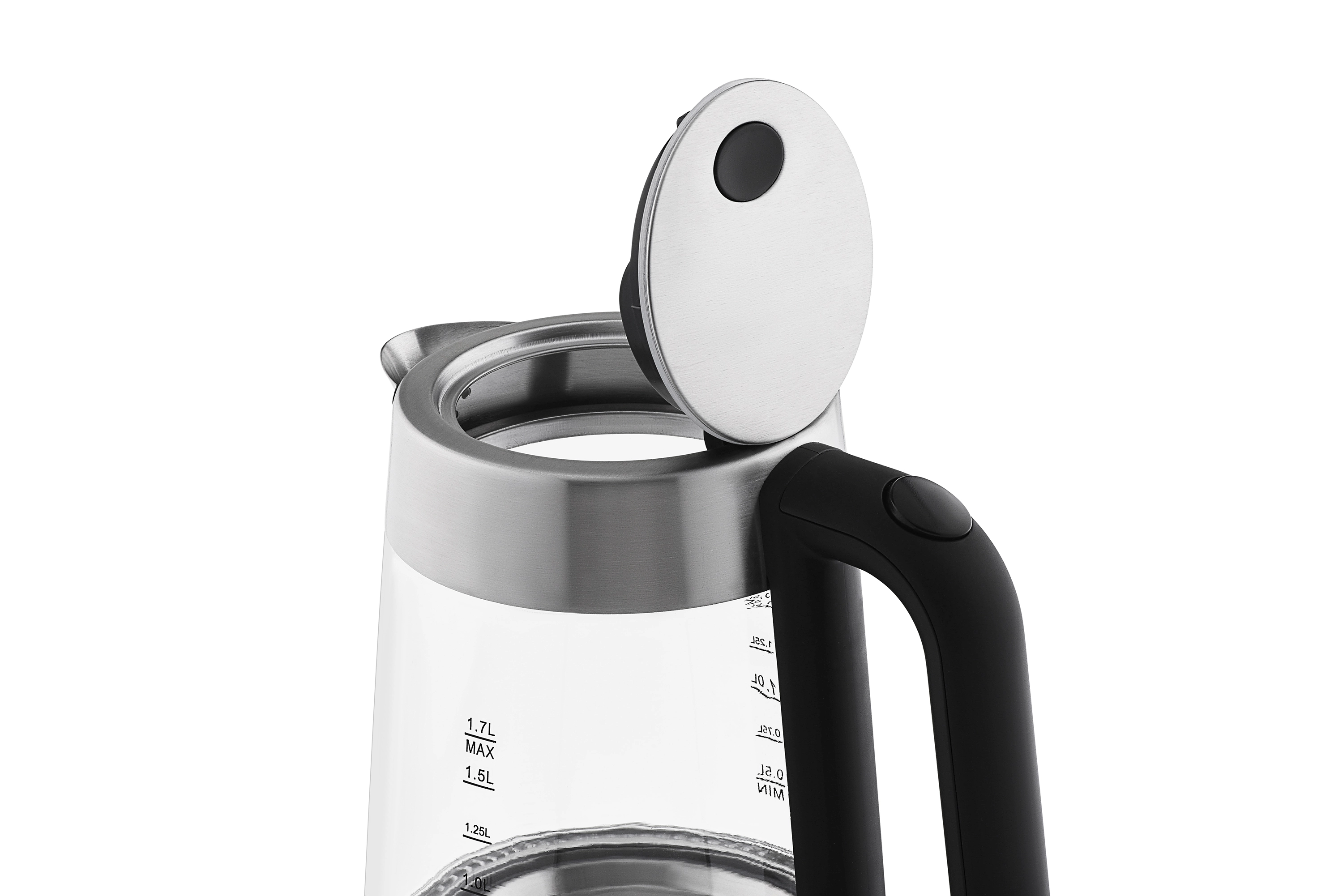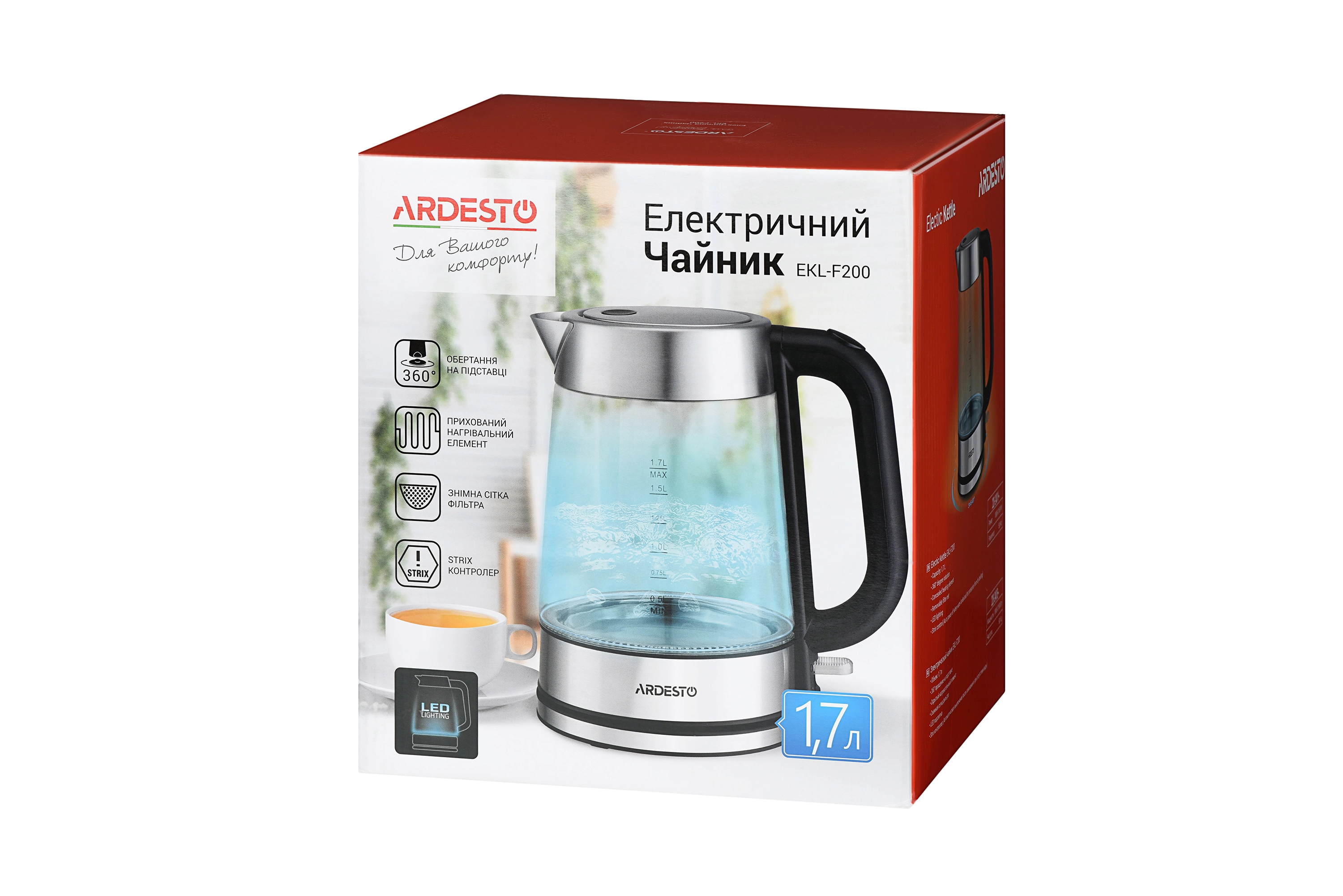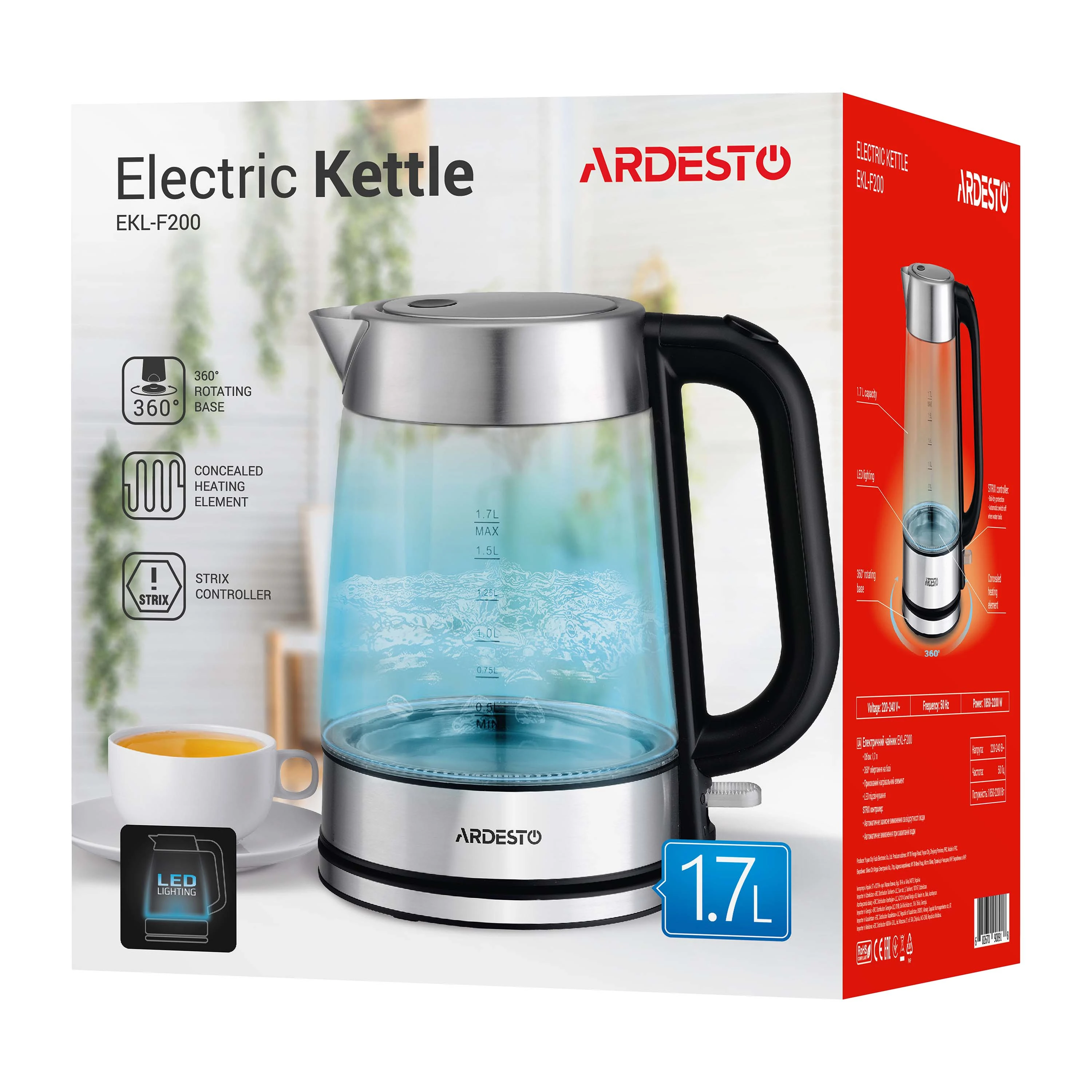 Прозорий скляний електрочайник з LED-підсвіткою та Strix-контролером для захисту від перегріву. Об`єм чайника EKL-F200 складає 1,7 літра, а підставка забезпечує оберт на 360°. Матеріал підставки, основи та ручки – полікарбонат чорного кольору та шліфований метал. Основна частина чайника виконана з міцного загартованого скла з відмітками об’єму від 0.5 л до 1.7 л.