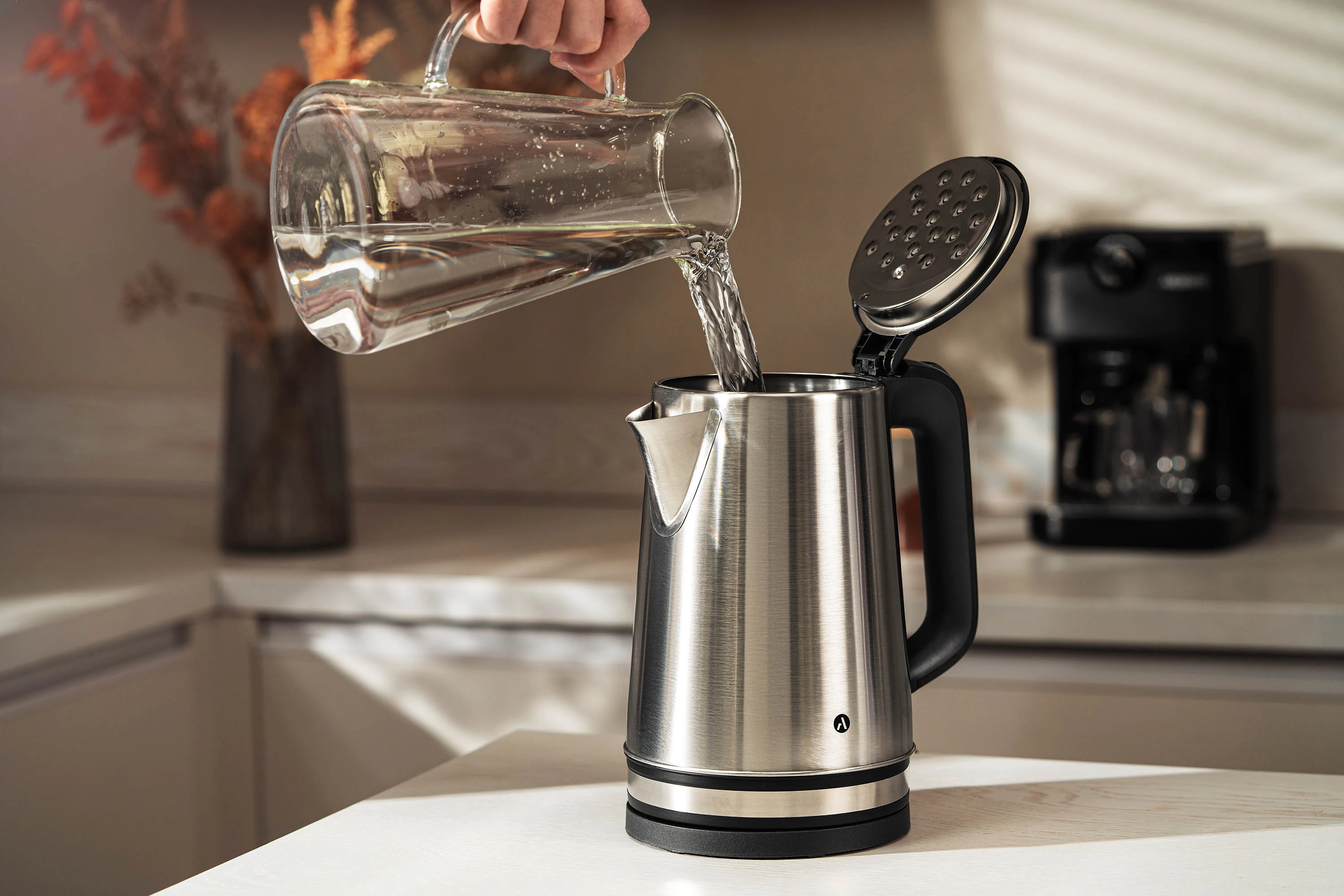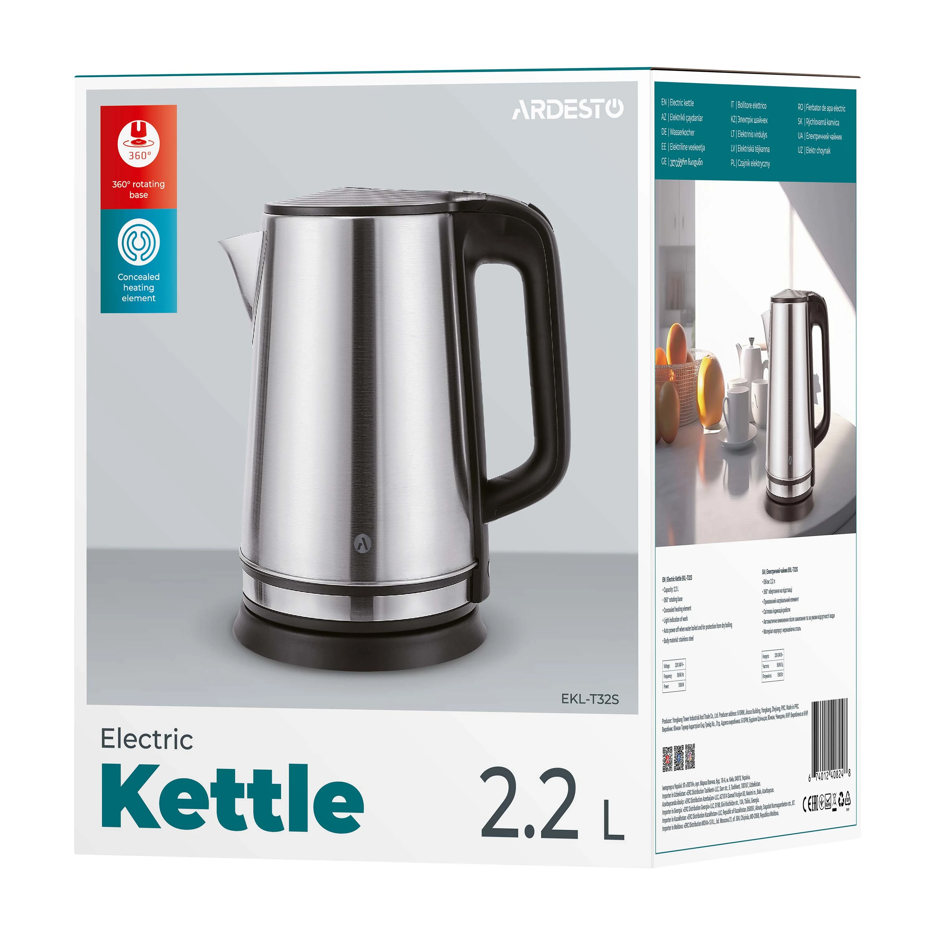 Електричний чайник ARDESTO EKL-T32S має корпус стриманого дизайну з нержавіючої сталі об’ємом 2.2 л. Потужності 1 500 Вт цілком достатньо, аби закип’ятити максимальний об’єм води за кілька хвилин. Нагрівальний елемент ізольовано, не контактує з водою. Передбачено світлову індикацію, автоматичне вимкнення після закипання та в разі браку води. У комплекті – підставка, що забезпечує обертання пристрою на 360°.