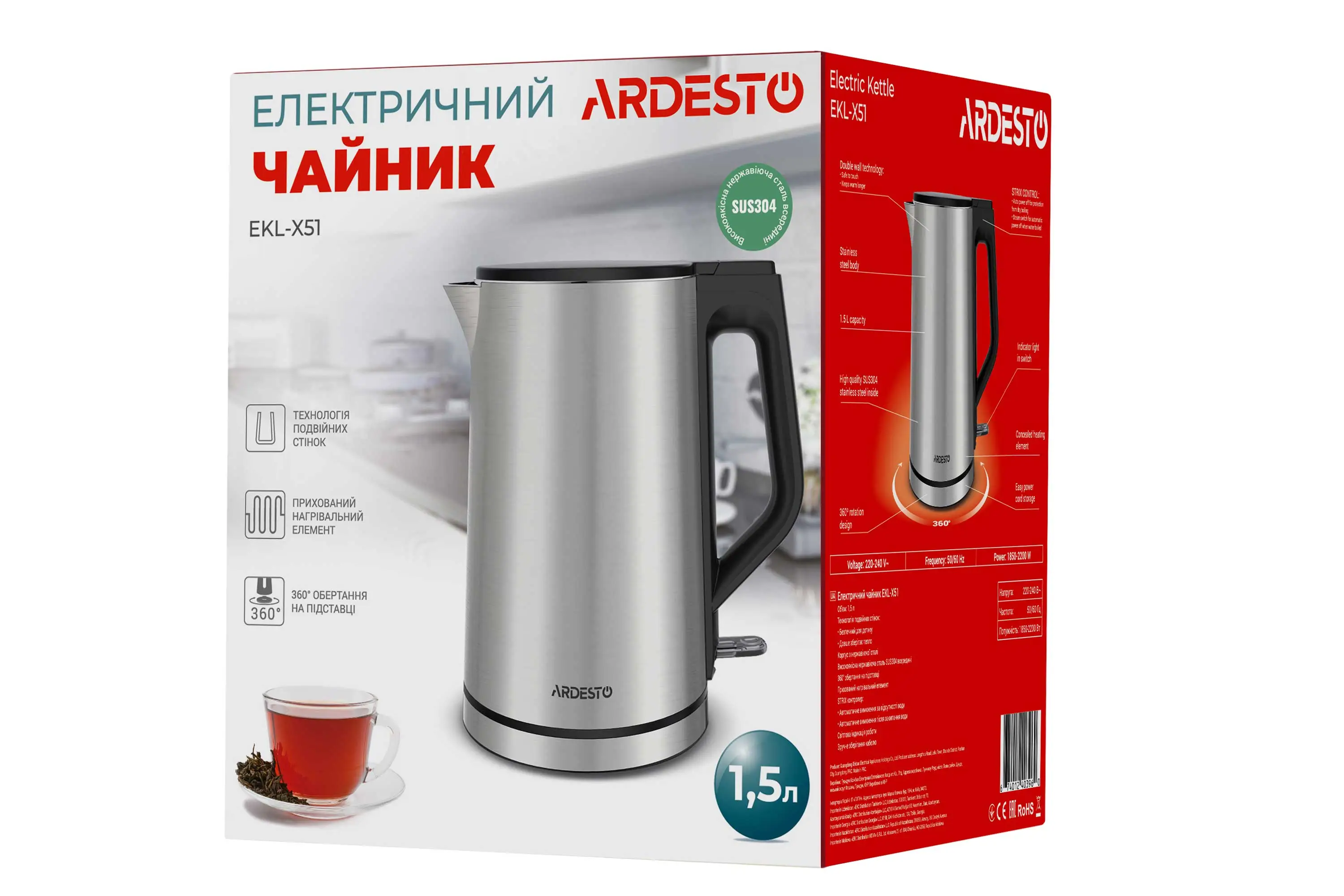 Електрочайник ARDESTO EKL-X51 стриманого дизайну має об’єм 1,5 л. Нагріває воду максимально швидко, адже потужність становить 1 850 – 2 200 Вт. Завдяки нержавіючій сталі ззовні та всередині чайник не тільки має стильний вигляд, але й захищений від механічних пошкоджень і швидкого охолодження води.