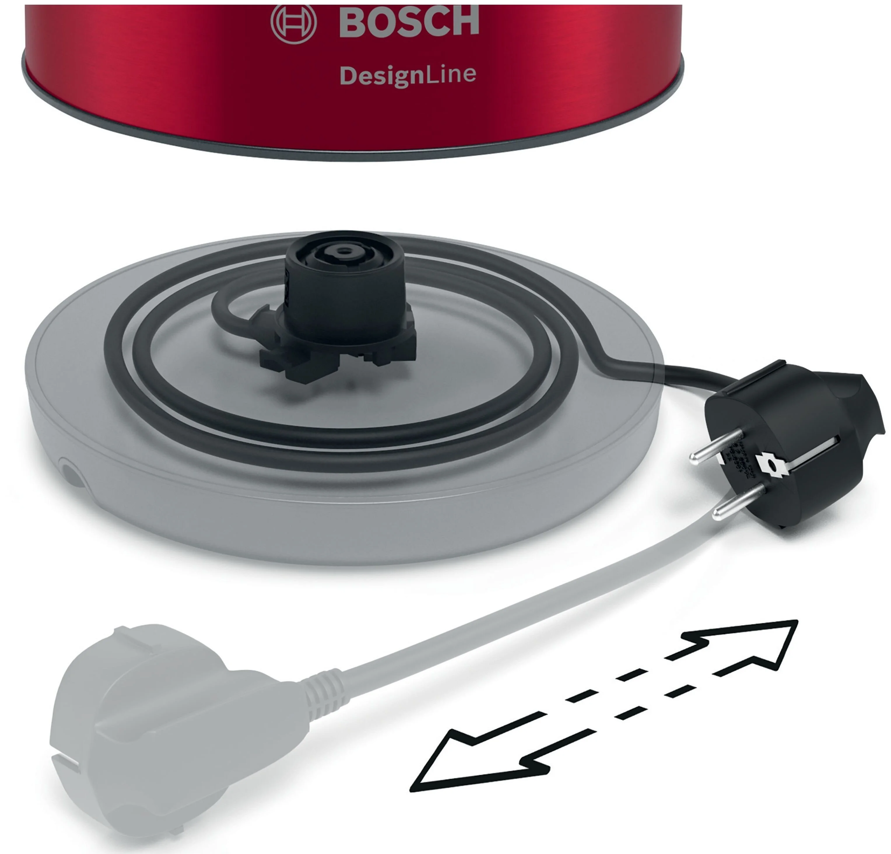 Електрочайник Bosch, 1.7л, метал, червоний TWK4P434. Індикатор чашки дає можливість кип'ятити кількість води, необхідну для певної кількості чашок. А також економить споживання енергії та часу. Чайник на підставці з можливістю обертання на базі на 360°, для більш зручного використання. Кабель можна зручно укласти всередину підставки, так що зовні залишиться тільки вилка. Підставка має неймовірну стійкість завдяки гумовим ніжкам.