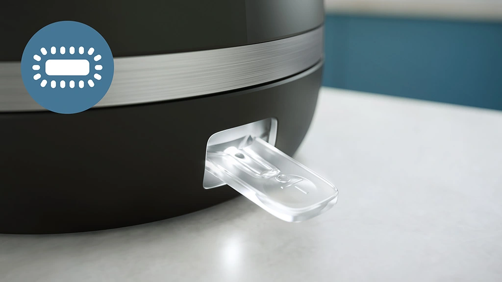 Чайник Philips Double Walled Kettle має внутрішню основу із нержавіючої сталі з широким отвором, який дозволяє швидко закип’ятити воду та легко чиститься. Вбудований контролер Strix забезпечує автоматичне вимкнення чайника, коли в ньому немає води або його знімають з основи. Це знижує ризик нагрівання без води, що може призвести до пошкодження приладу й запобігає втраті електроенергії. Просто встановіть чайник на основу й поверніть його в потрібне положення за допомогою зручного поворотного центрального конектора