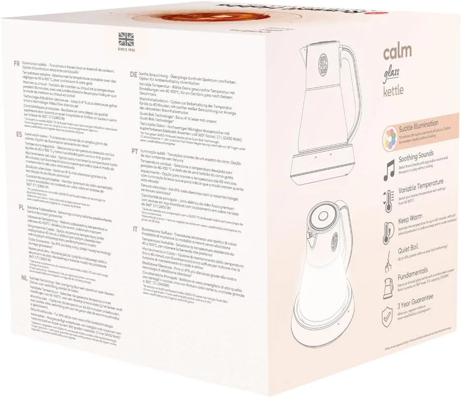 Електрочайник Russell Hobbs Calm – це поєднання елегантного дизайну, міцних матеріалів і сучасних технологій. Його прозорий корпус із високоякісного скла дозволяє спостерігати за процесом кип’ятіння, а стильні мідні акценти додають вишуканості інтер’єру. Завдяки об’єму 1,7 л він ідеально підходить для сімейного використання. Потужний нагрівальний елемент забезпечує швидке закипання, а вбудований фільтр від накипу гарантує чистоту води. Зручна підставка з обертанням на 360° робить чайник комфортним у використанні для будь-якої руки.