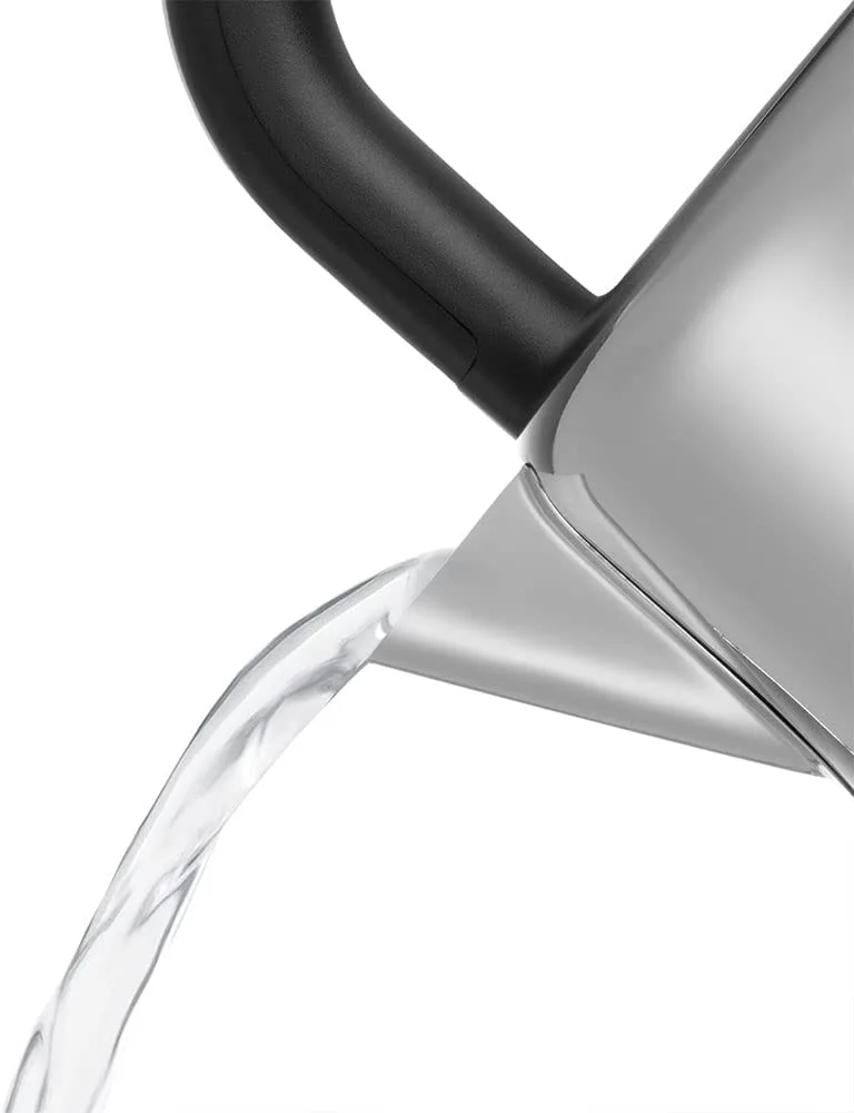 Чайник виготовлений з матової нержавіючої сталі з лакованими та полірованими деталями, функцією швидкого закипання на 1, 2 або 3 чашки. Ергономічна ручка унікальної форми з полірованим акцентом, основа з поворотом на 360° та скручуванням кабелю.