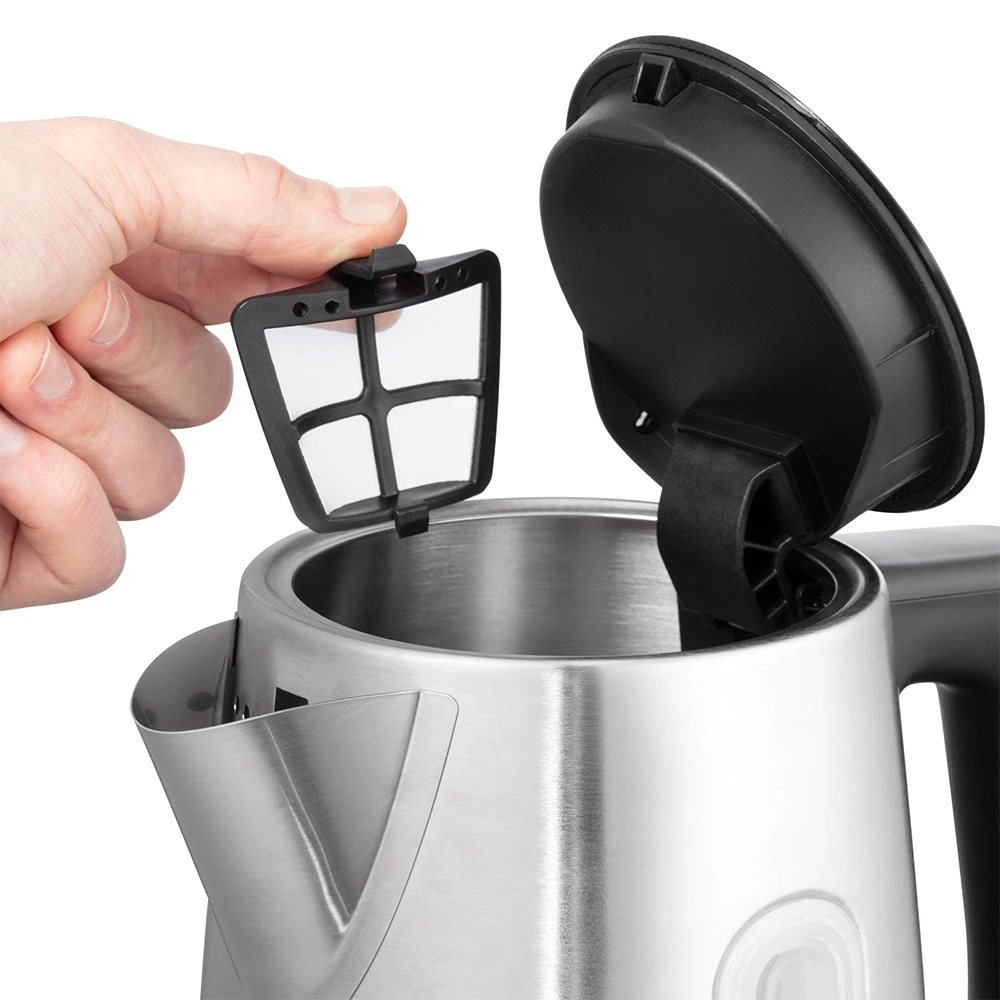 Електрочайник Russell Hobbs Heaton виготовлений з матової нержавіючої сталі, має об’єм 1,7 л та ідеальний носик для точного наливання. Оснащений кнопкою для відкривання кришки, перемикачем із синім підсвічуванням під час кипіння та віконцем для води з манометром. Має знімний миючий фільтр проти накипу і базу на 360° з місцем для зберігання шнура.