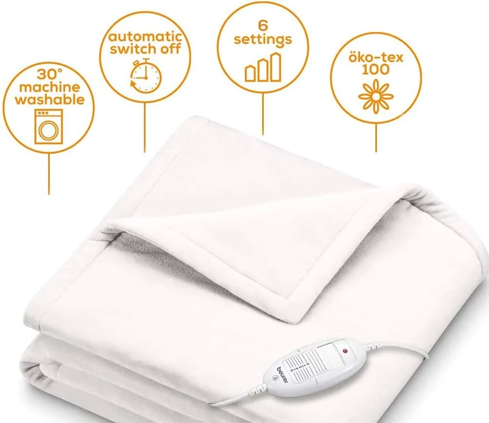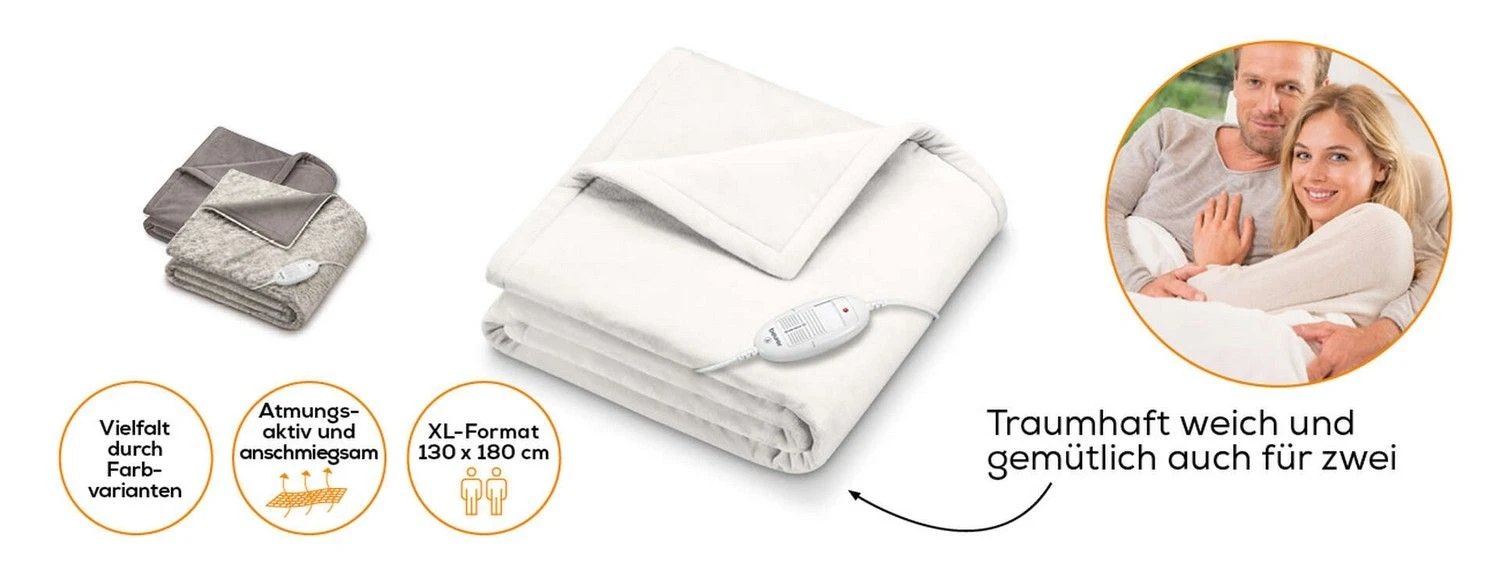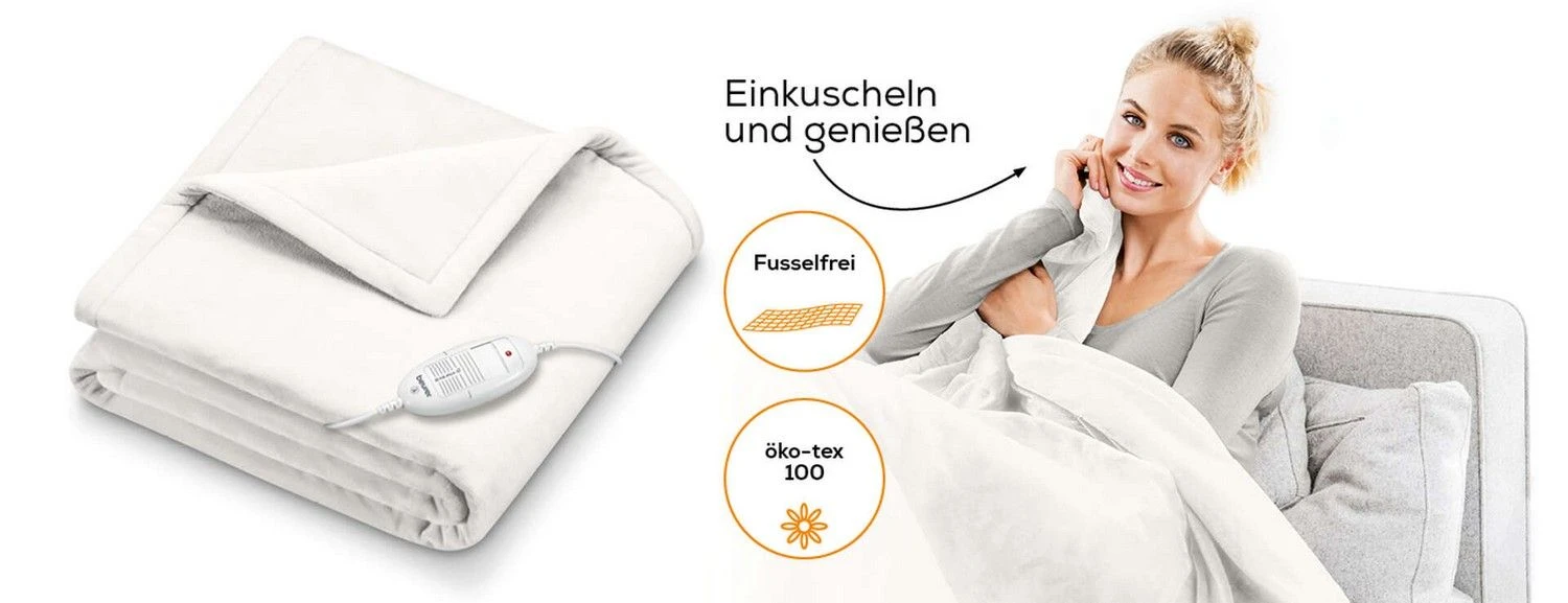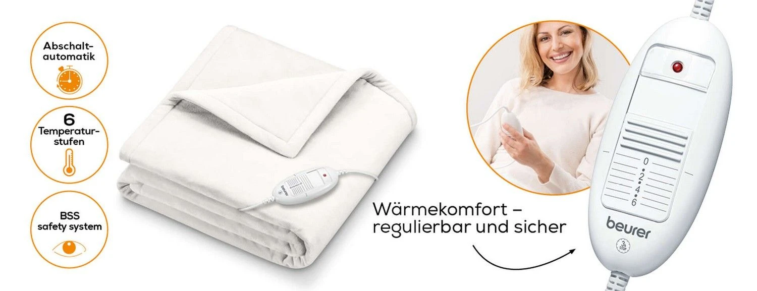 М'яка електроковдра з флісу. Дарує індивідуальне тепло і затишок за будь-якоъ погоди, На вибір шість температурних режимів для максимально комфортного використання. Споживає мало електроенергії, гарантує безпечне використання з системою BSS. Автоматичне вимкнення приблизно через 3 години. Запатентована система електронного регулювання температури. Інформаційний дисплей з підсвічуванням.Система безпеки Beurer (BSS). Можна прати в машині при 30 °C.