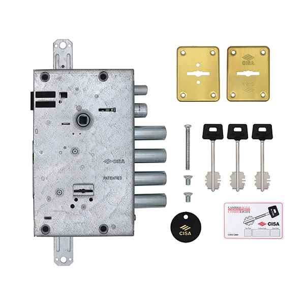 - Додаткова комплектація: зворотня планка, роздільна планка, адаптер під шток, кабель, кабелепрохід. Є аналогом врізного механізму CISA 17685.