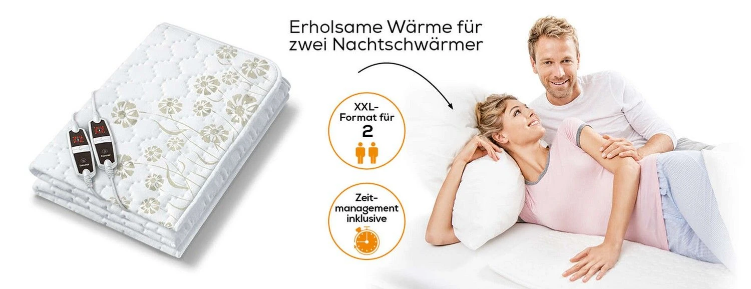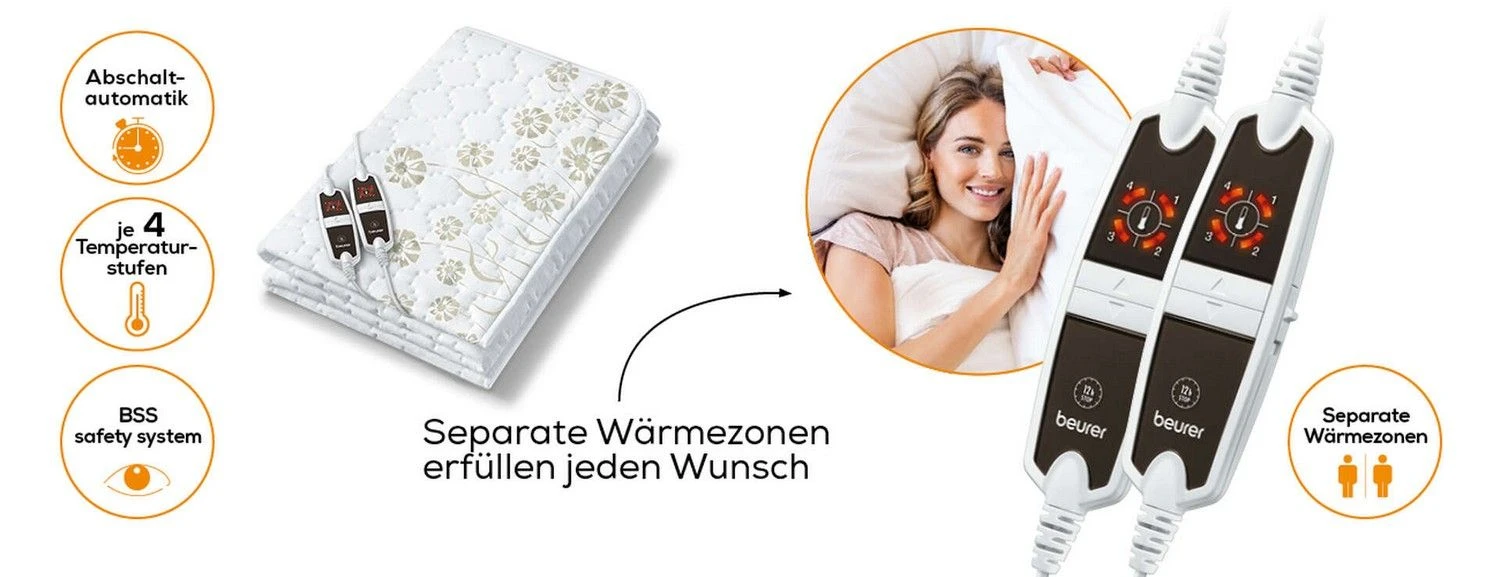 Електропростирадло Beurer, від мережі, 150х160см, 60+60Вт, 4 режими, роздільне налаштування зон обіг