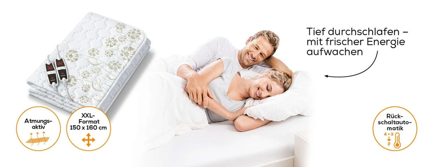 Електропростирадло для двоспального ліжка. Дві окремі зони налаштування обігріву для індивідуального комфорту. Міцний здоровий сон в будь-яку погоду. Два інноваційних світлодіодних кнопкових контролера для двох зон обігріву з індивідуальним регулюванням. Дві зони і чотири температурні режими для кожного користувача. Автоматичне вимкнення приблизно через 12 годин. Автоматичне перемикання режиму з рівня 4/3 на рівень 2 через 3 години. Відображення температури з підсвічуванням.