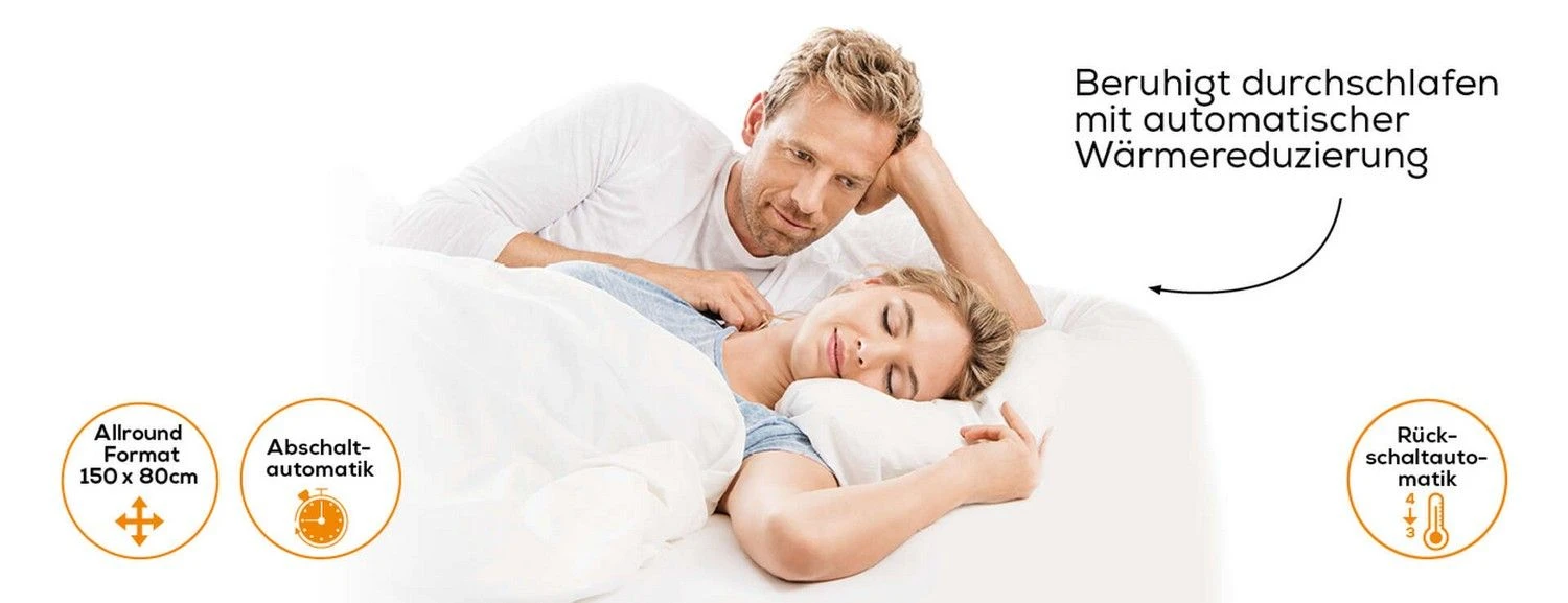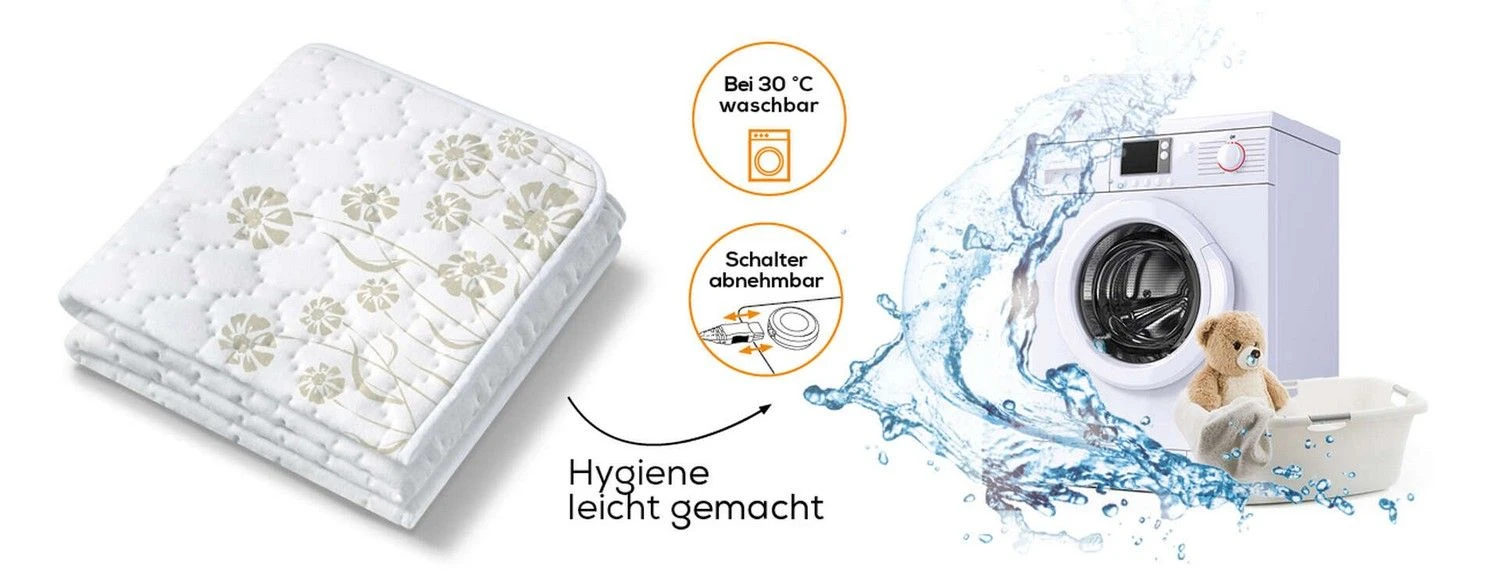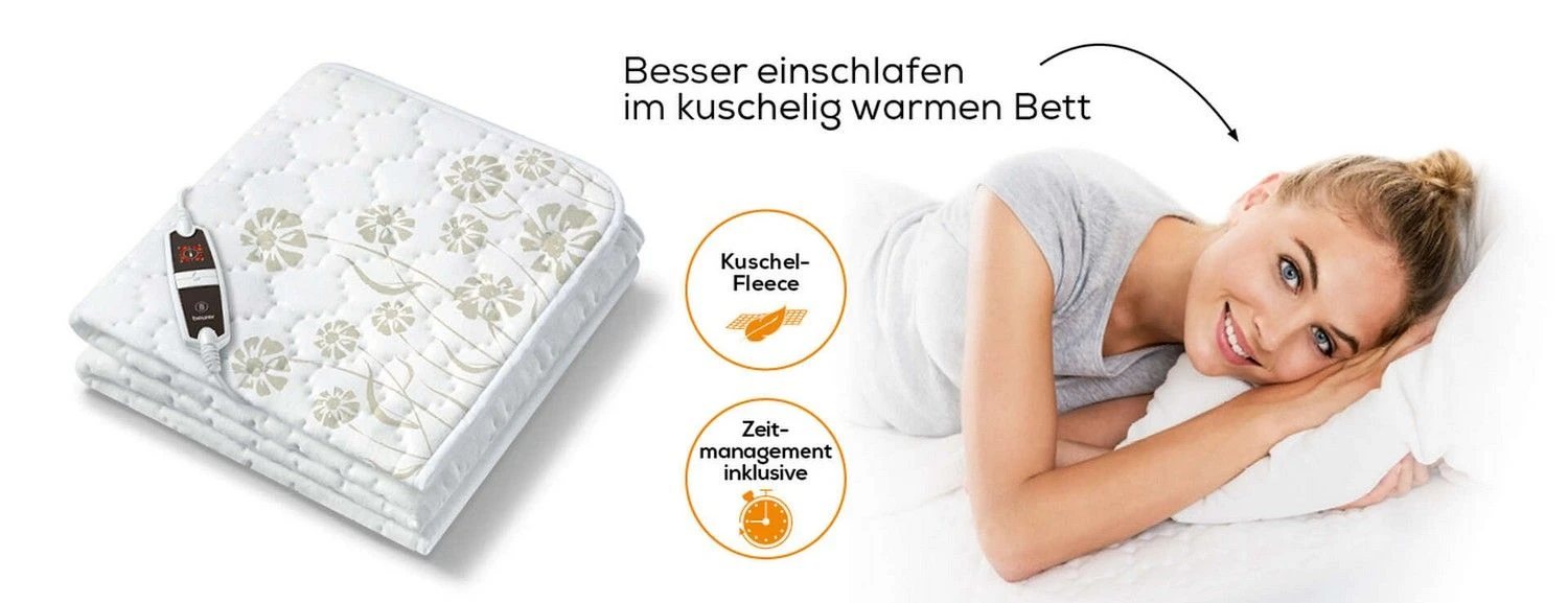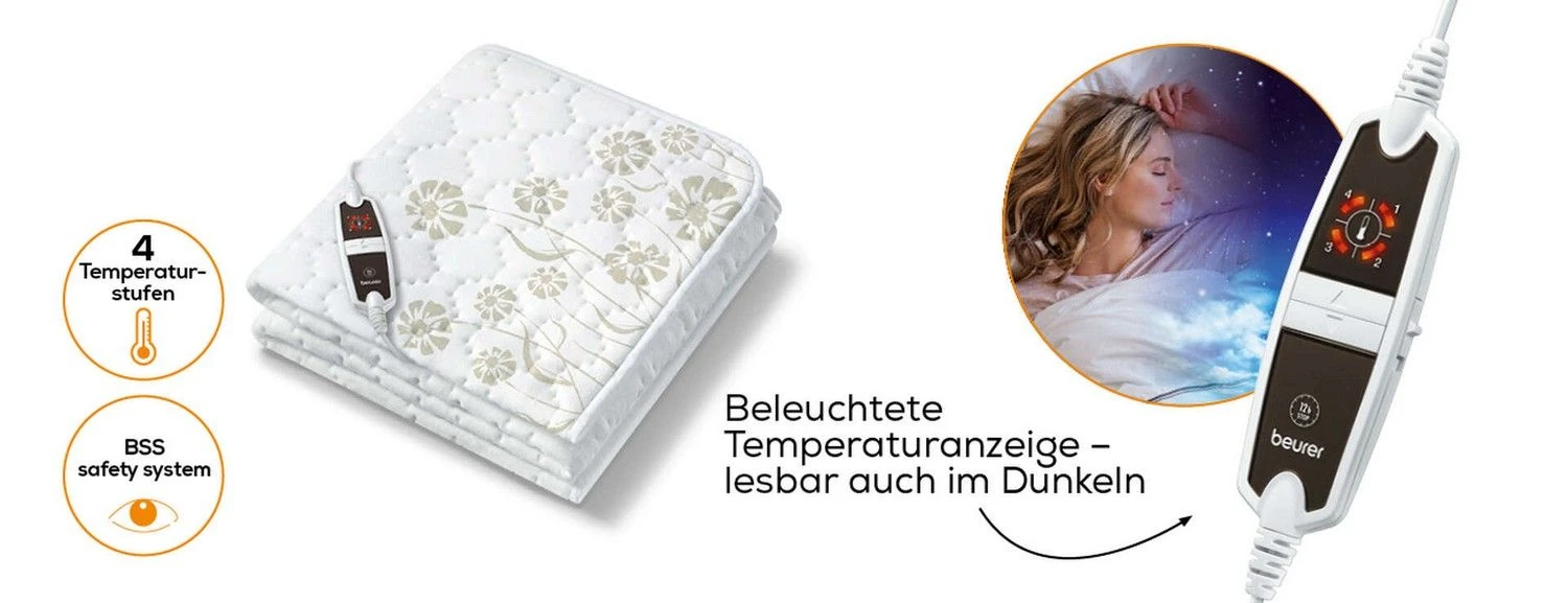 Простирадло з ошатним набивним малюнком та чотирма налаштуваннями температури оточить теплом та комфортом. Автоматичне вимикання приблизно за 12 годин. Автоматичне перемикання режиму через 3 години з рівня 4/3 на рівень 2. Відображення температури з підсвічуванням. Інноваційний світлодіодний кнопковий контролер