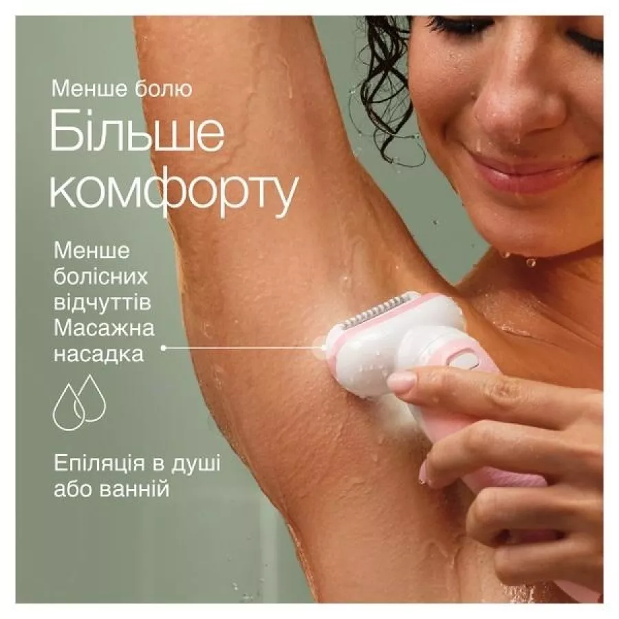 Повністю водонепроникний, можна користуватися у ванній або душі. Процедура стає практично безболісною при регулярному застосуванні епілятора у воді.