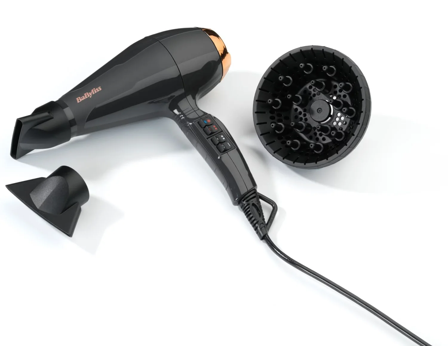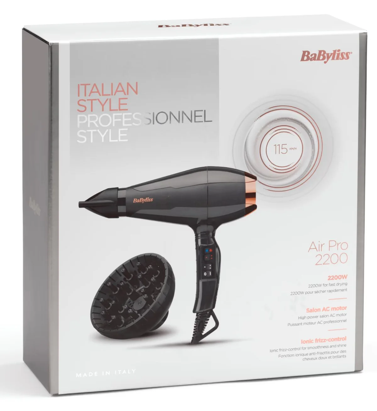 Фен BaByliss 6719DE італійського виробництва має потужність 2200 Вт, професійний AC мотор зі швидкістю повітря 115 км/год та функцію іонізації. Пропонує 2 температурних режими, 2 швидкості та кнопку для подачі холодного повітря. У комплекті дві ультратонкі насадки, а також дифузор для створення об'єму та зменшення завитків. Довгий професійний шнур додає зручності в роботі.