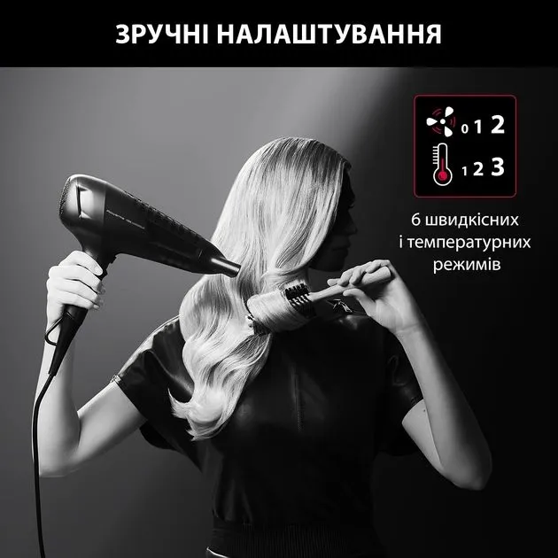 Фен Rowenta STUDIO DRY x KARL LAGERFELD CV581LF0. Швидке висихання без зайвих зусиль: фен Rowenta x KARL LAGERFELD Studio Dry Fen забезпечує бездоганне сушіння та привабливий стиль. Енергозберігаючий мотор потужністю 2300 Вт забезпечує ідеальні результати сушіння в найкоротші терміни, а функція Thermo Control захищає волосся від надмірного тепла та підтримує здоров'я та блиск вашого волосся. Легкі налаштування швидкості/температури забезпечують повний контроль над вашим стилем, з тонким концентратором для створення найдрібніших деталей.