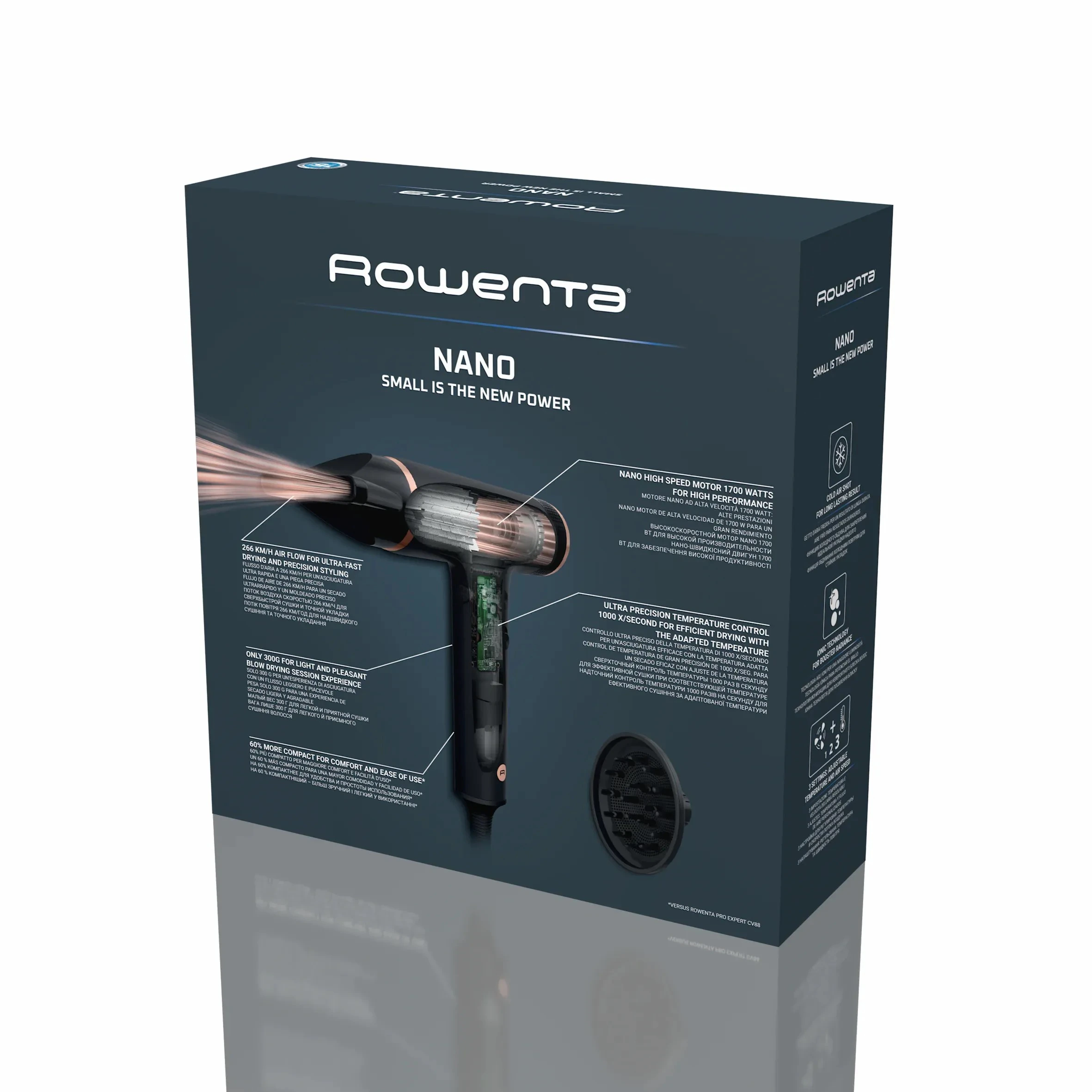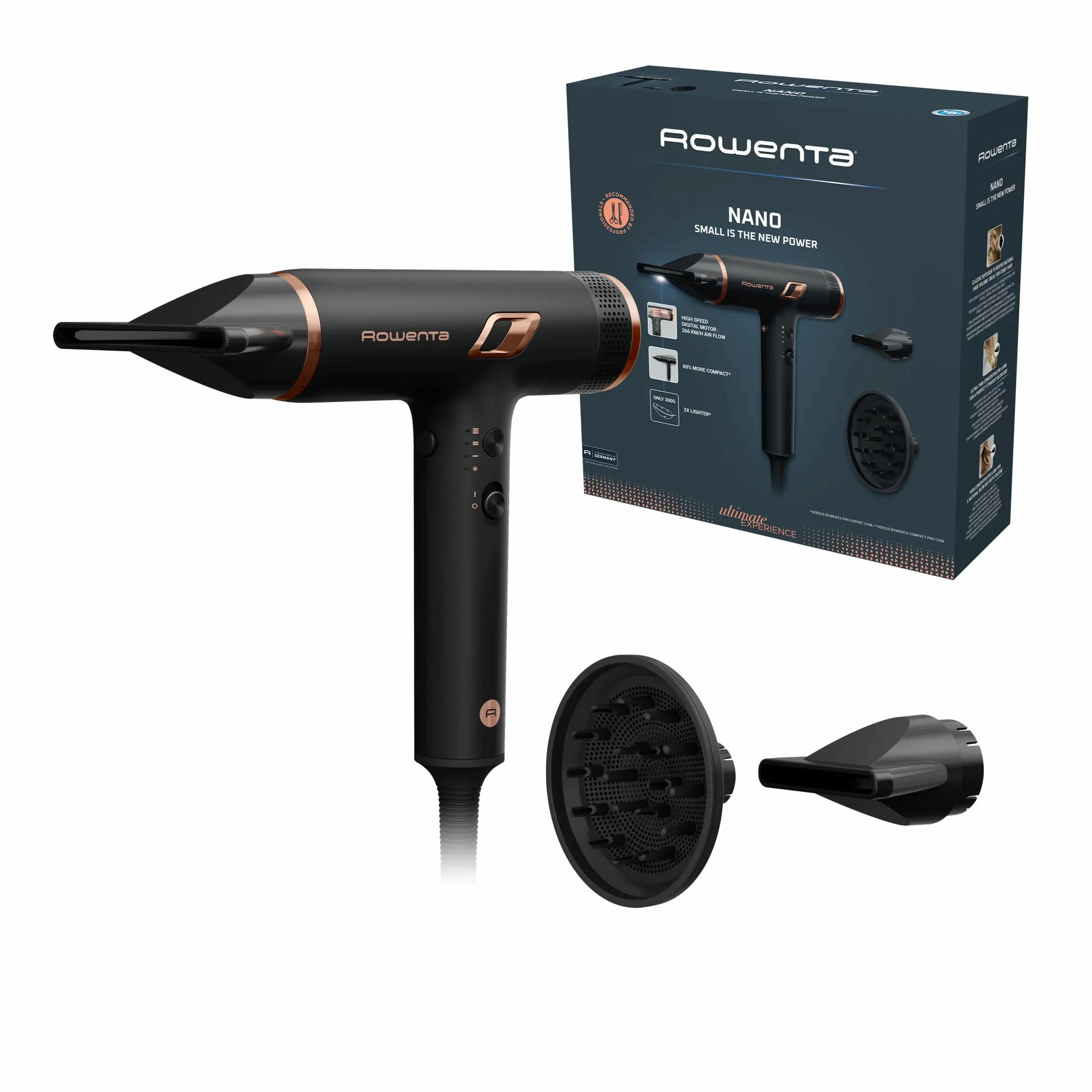 Компактний та потужний фен Rowenta Maestria Nano для швидкої і точної сушки волосся. Завдяки технології Nano, потужність двигуна забезпечує швидкість повітряного потоку до 266 км/год, що дозволяє ефективно укладати волосся, уникаючи перегріву. Фен важить лише 300 г, що робить його ідеальним для подорожей і тривалого використання без втоми. У комплекті передбачено насадки-концентратори (4 мм і 6 мм) та дифузор для створення об’єму і чітких локонів.