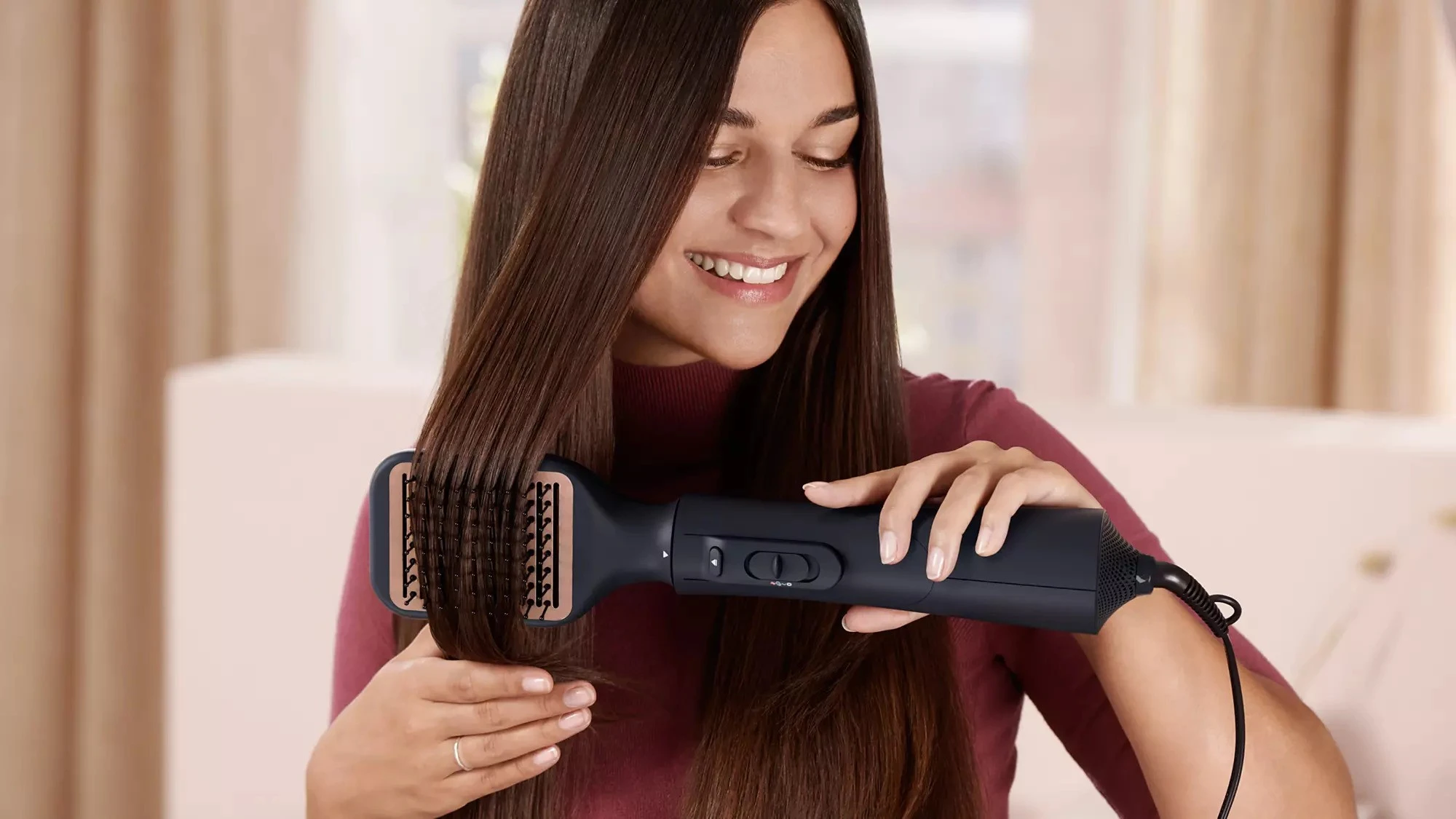 Фен-щітка Philips 5000: 5 насадок для різноманітних видів укладки. Технологія рівномірного розподілу тепла забезпечує кращий захист волосся, а завдяки функції іонізації воно стає більш сяючим та блискучим