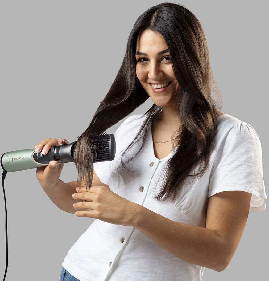 Botanicals Rotating Airstyler сушить і укладає в одному, даючи вам свободу та гнучкість у створенні стилю кожного дня. Його вдосконалене керамічне покриття поєднує в собі елементи, що покращують красу, знайдені в природі, а також екстракти алое вера, жожоба та троянди для посилення блиску та м’який температурний режим BotaniCare від Remington для захисту та догляду за вашим волоссям шляхом укладання за нижчої температури. Незалежно від вашого вигляду, іонне кондиціонування запобігає завиткам і розлітанням, щоб щоразу гарантувати результат, готовий до селфі.