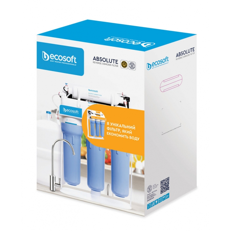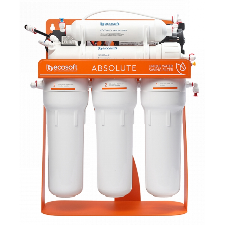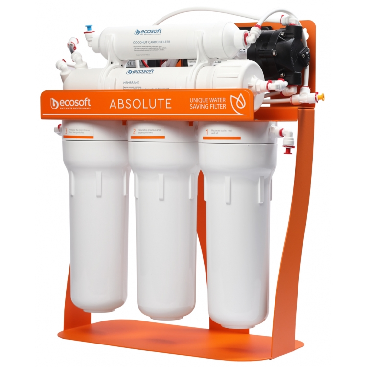 Унікальна модель фільтра зворотного осмосу Ecosoft Absolute з помпою на станині тепер забезпечує економне використання води. Оновлений фільтр на 1 літр очищеної води скидає в каналізацію лише 1 літр стічних вод. Завдяки використанню американської мембрани Ecosoft 75GPD та продуманій технології очищення фільтр економить до 20 000 літрів води за рік. Постійний резерв питної води до 7 л завдяки накопичувальному баку. Фільтр зворотного осмосу Ecosoft Absolute з помпою призначений для очищення води на молекулярному рівні в будинках та квартирах зі слабким напором в трубопроводі. Фільтр стійкий завдяки металевій підставці. Продуктивність фільтра — 12 л/год.